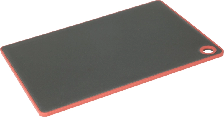 Pratique planche de cuisine en plastique de qualité avec rebord en TPE offrant une haute résistance aux rayures, une stabilité antidérapante et un entretien facile. N’absorbe ni les odeurs ni les liquides et est compatible lave-vaisselle. Grâce à l’ouverture de suspension, elle économise de la place sur le plan de travail.