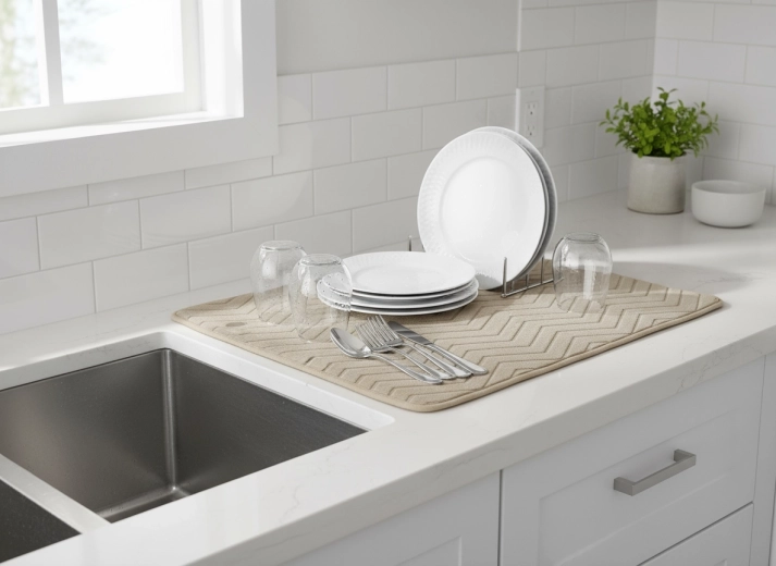 Gardez l’évier et le plan de travail de votre cuisine au sec et bien rangés. Le tapis de séchage en microfibre 100 % polyester absorbe rapidement l’humidité et offre une surface douce et sûre pour déposer la vaisselle lavée. Un excellent choix pour un usage quotidien, notamment pour les verres délicats et la porcelaine fine.