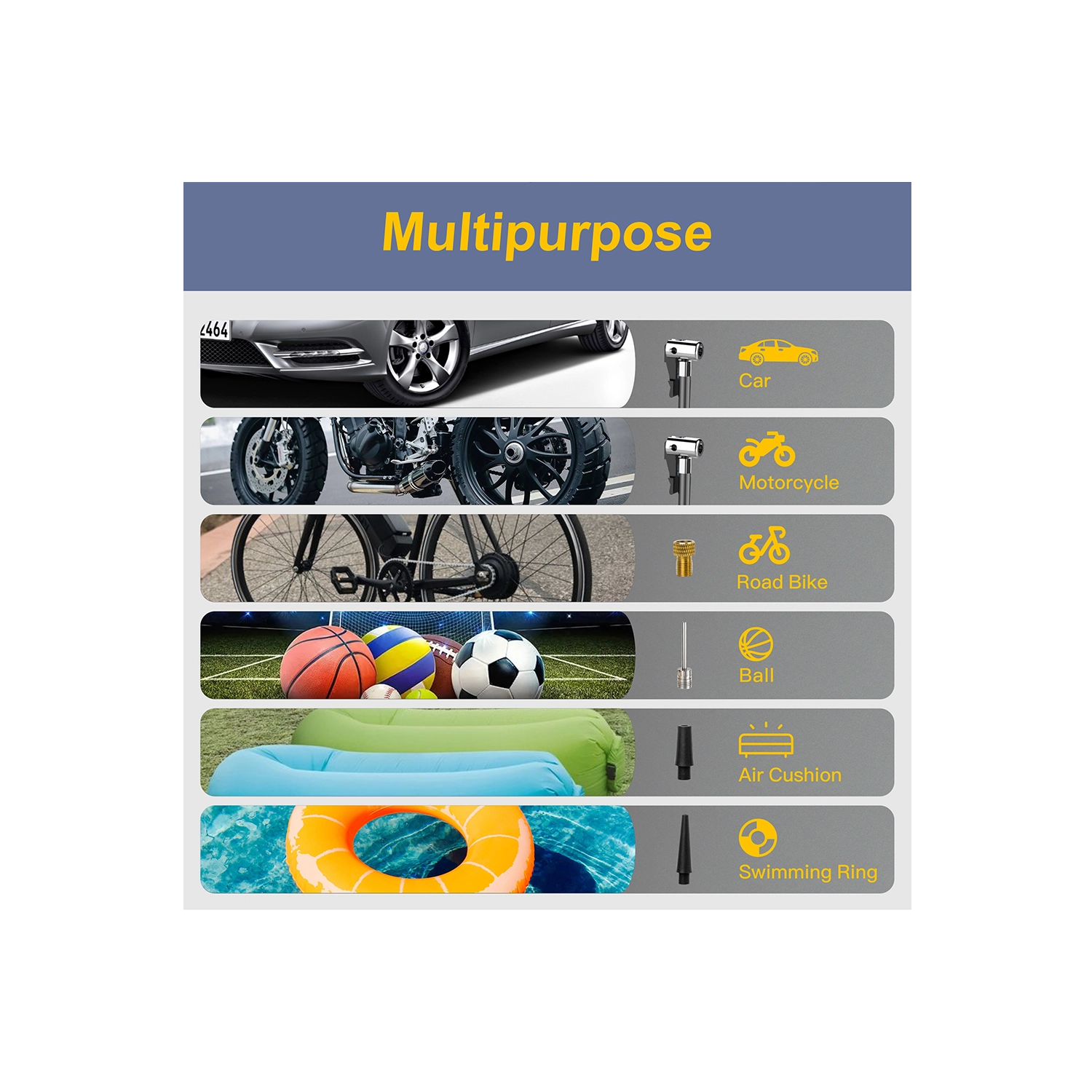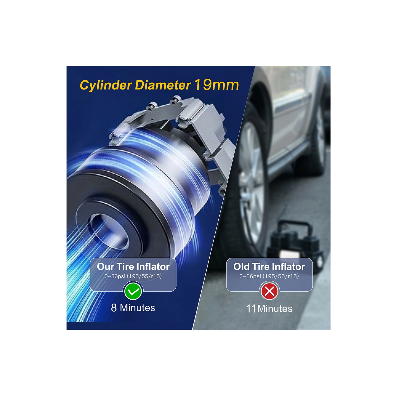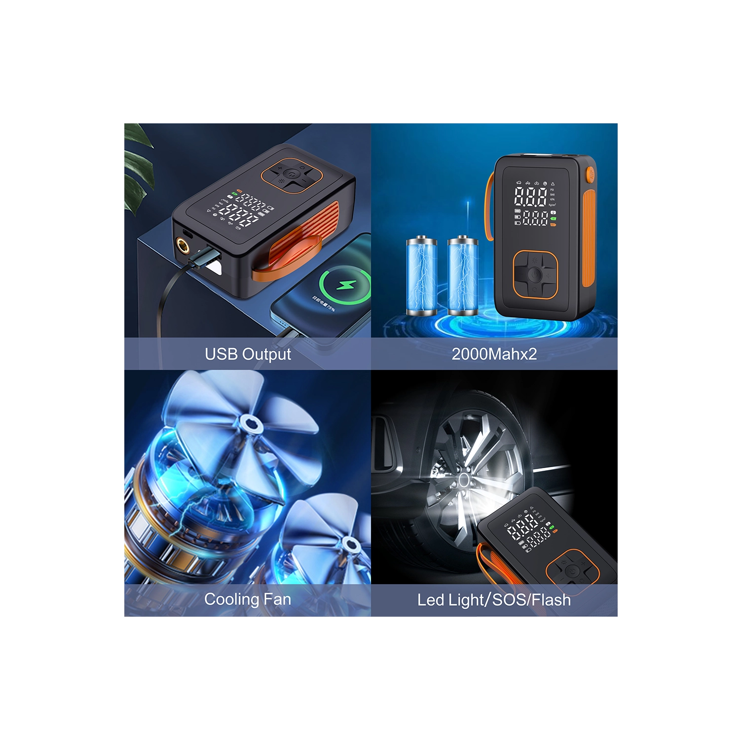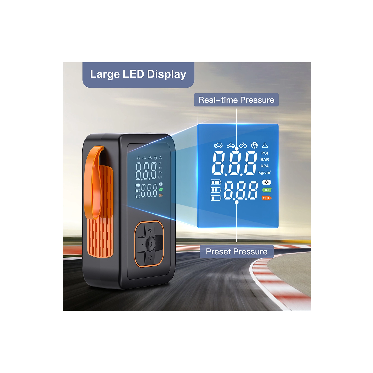 Choisissez parmi 5 modes rapides (voiture, moto, vélo, ballon de sport, manuel) et parmi 4 unités de pression (PSI, KPA, BAR, KG/CM²). Le mode manuel avec mémoire retient le dernier réglage. Un ventilateur de refroidissement intégré prolonge la durée de vie et une valve de dégonflage facilite l'ajustement fin de la pression. La lampe LED à 3 modes (standard, SOS, clignotant) améliore la sécurité lors du travail dans l'obscurité.