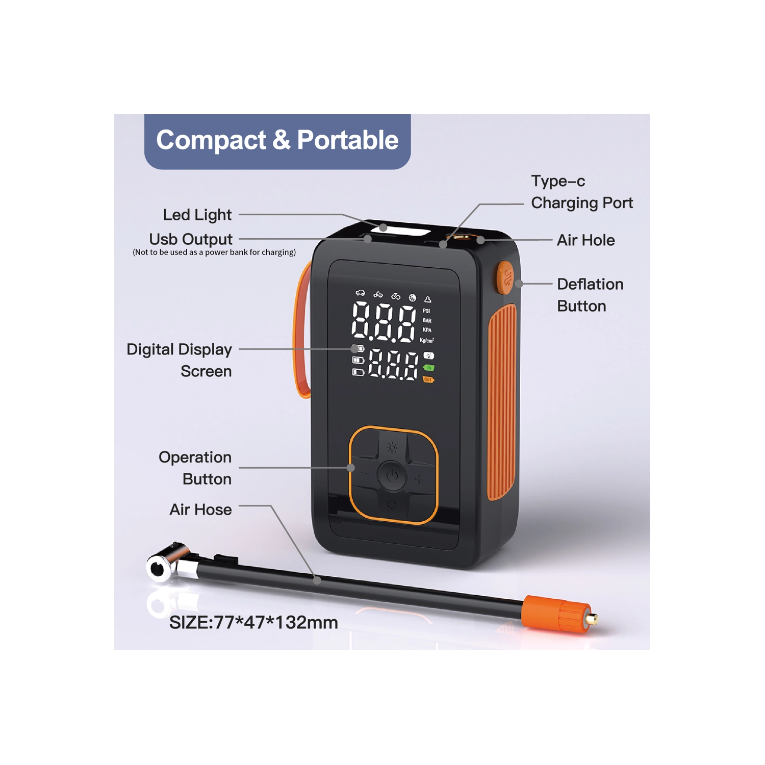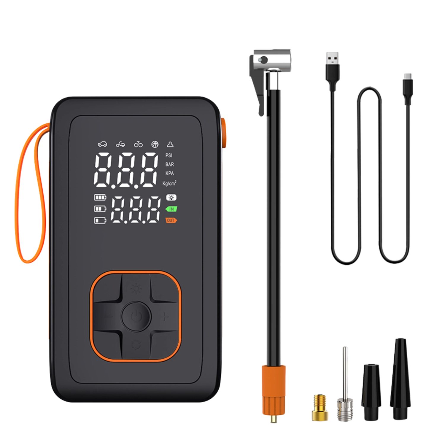 Cette pompe rechargeable 7,4 V combine un gonflage puissant jusqu'à 150 PSI / 10,3 BAR avec une pratique fonction de powerbank. Grâce à ses dimensions compactes et à sa poignée ergonomique, elle est idéale en voyage, dans la voiture ou à l'atelier. Le double écran numérique affiche la valeur de pression réglée et la valeur actuelle, tandis que l'arrêt automatique stoppe le gonflage une fois l'objectif atteint.