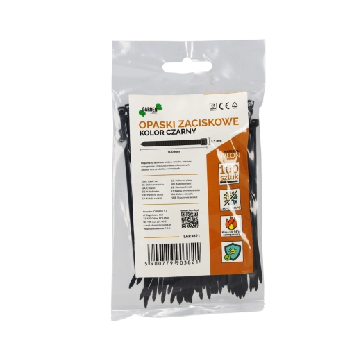 Les colliers de serrage en nylon noir de 2,5 × 100 mm sont idéaux pour le liage rapide et solide de câbles, tuyaux et autres éléments. Grâce à une composition de matériau spéciale avec protection UV, ils résistent aux conditions extérieures plus exigeantes. Le matériau répond à la classe d’inflammabilité UL 94 V2, est auto‑extinguible et convient à une utilisation sûre en électrotechnique et en industrie.