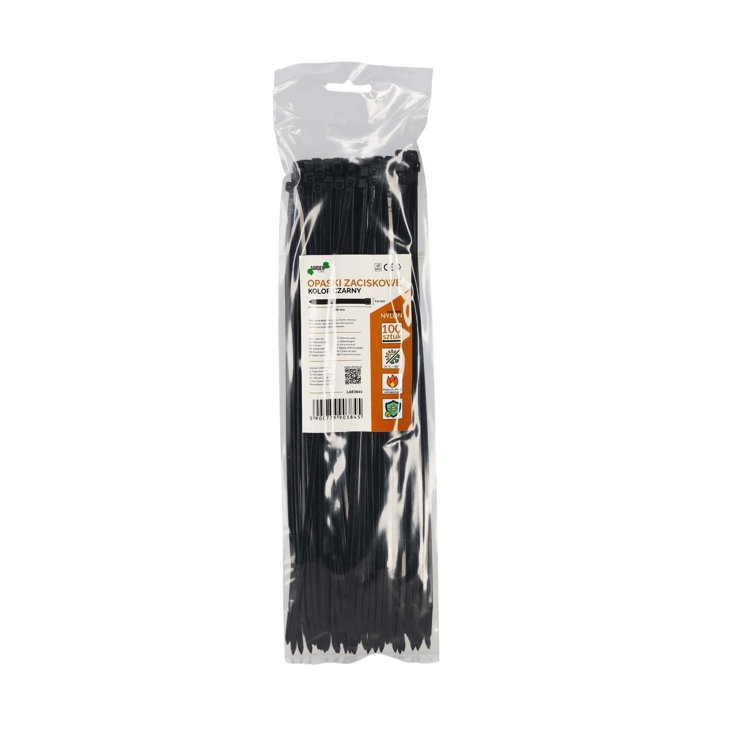 Lot pratique de colliers de serrage noirs de 3,6 × 300 mm pour une utilisation universelle à la maison, à l’atelier et en industrie. Fabriqués en nylon de qualité avec classe autoextinguible UL 94 V2, résistance aux UV et un large intervalle de températures d’utilisation. Les colliers sont résistants aux huiles, lubrifiants, essence et détergents, l’emballage contient 100 pièces.