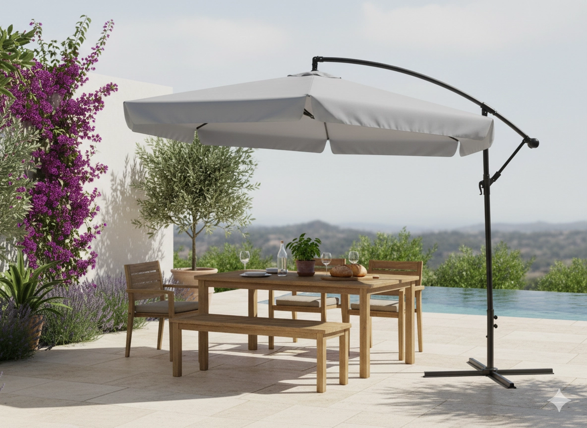 Structure moderne de type BANANE sans mât central pour libérer l’espace sous le parasol et améliorer le confort autour de la table à manger comme sur le transat. La large surface d’ombrage de 300 cm (env. 350 cm selon la toile) procure une ombre fiable pour la famille et les amis, tandis que l’ouverture d’aération au sommet améliore la circulation de l’air et réduit la prise au vent.