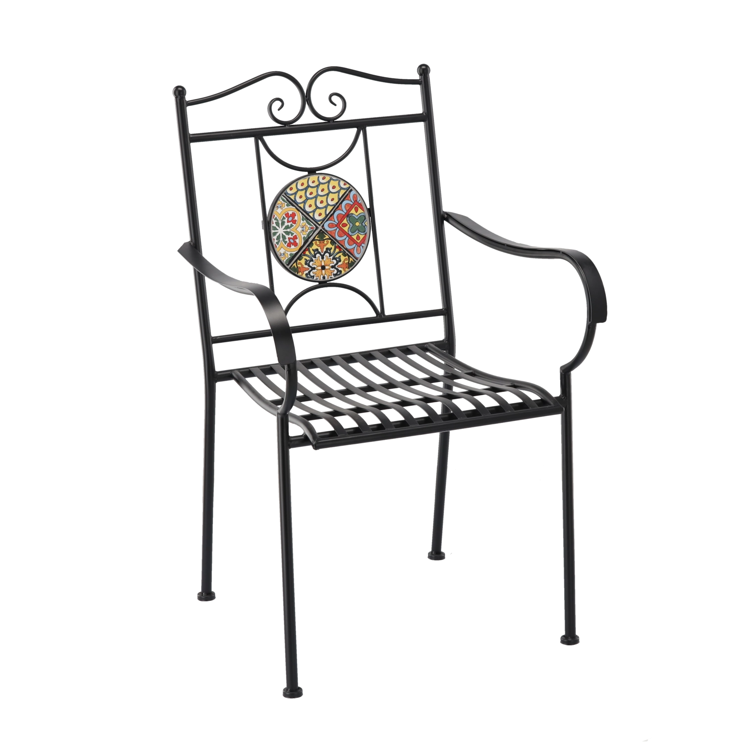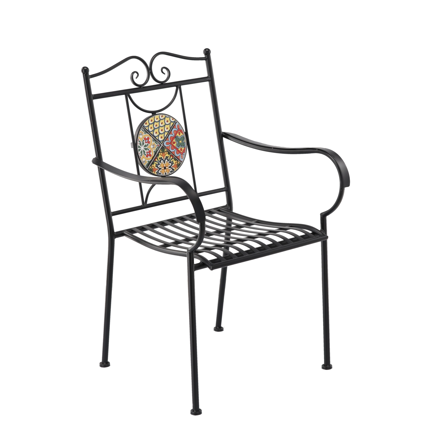 Le fauteuil de jardin en métal avec mosaïque séduit par son médaillon circulaire effet mosaïque dans le dossier et son cadre noir intemporel. Grâce à sa structure soudée solide et à son siège à lattes, il convient à une utilisation extérieure toute la saison et s’entretient facilement – l’eau s’écoule naturellement.
