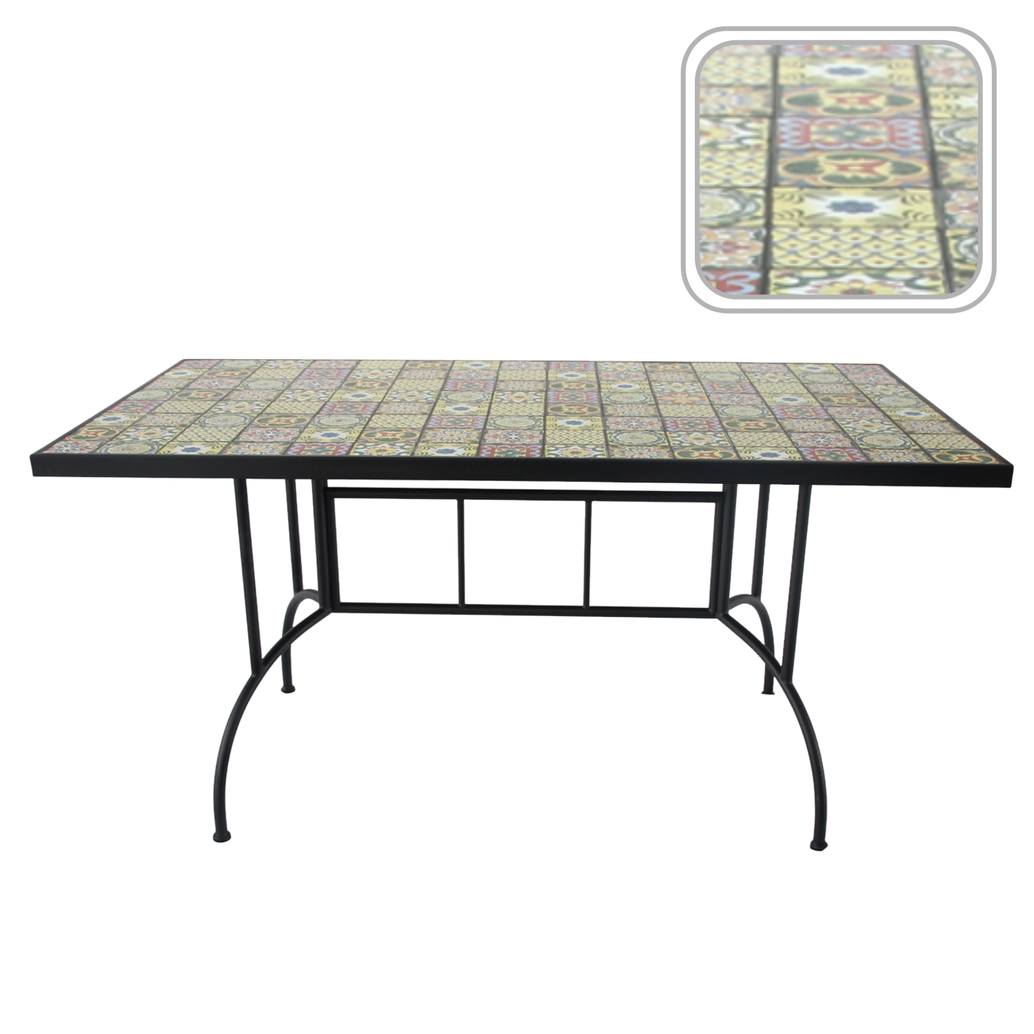 Les pieds métalliques stables avec renforts garantissent solidité et sécurité sur divers types de surfaces. La surface lisse et lavable du plateau en mosaïque se nettoie facilement, ce qui rend la table parfaite pour un usage quotidien comme pour les barbecues du week-end. Associez-la aisément à des chaises en rotin ou en métal pour créer un ensemble extérieur harmonieux.