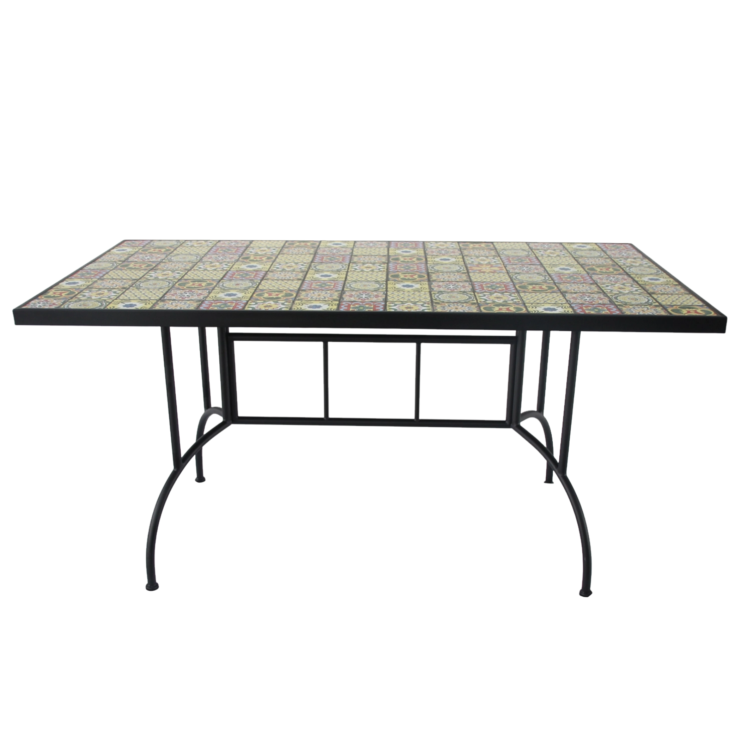Cette table rectangulaire en mosaïque de 150 × 80 × 74 cm est un choix idéal pour les repas en extérieur. La mosaïque colorée apporte une forte identité visuelle, tandis que le cadre métallique noir aux éléments décoratifs souligne un look moderne et intemporel. Grâce à son grand plateau, elle accueille confortablement plusieurs personnes et convient aux terrasses, jardins et patios.