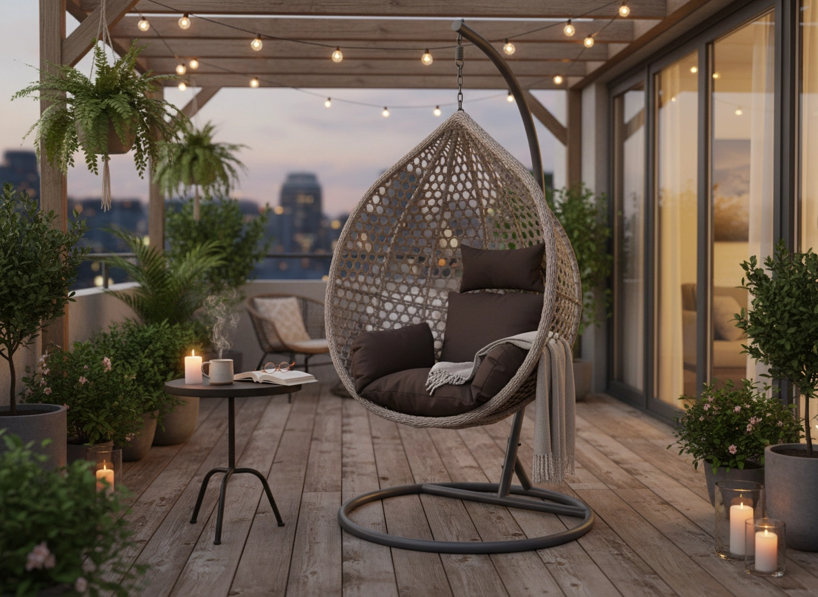 Ce fauteuil suspendu au coloris gris uniforme apporte une atmosphère apaisante et un grand confort sur toute terrasse, balcon ou dans le salon. Le cadre robuste gris foncé assure une stabilité et un balancement en toute sécurité, tandis que la large nacelle avec ses coussins moelleux invite à la détente. Grâce à son design intemporel et à ses matériaux résistants, il est idéal pour la relaxation comme pour un usage quotidien, à l’intérieur comme à l’extérieur.