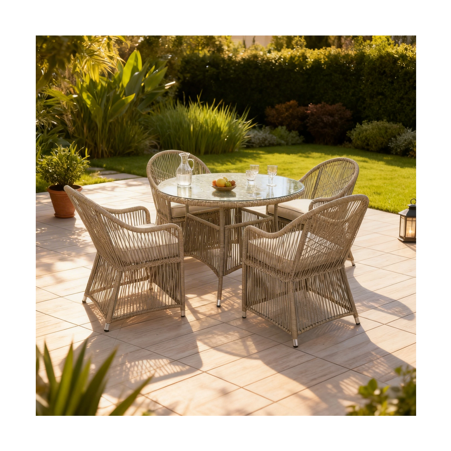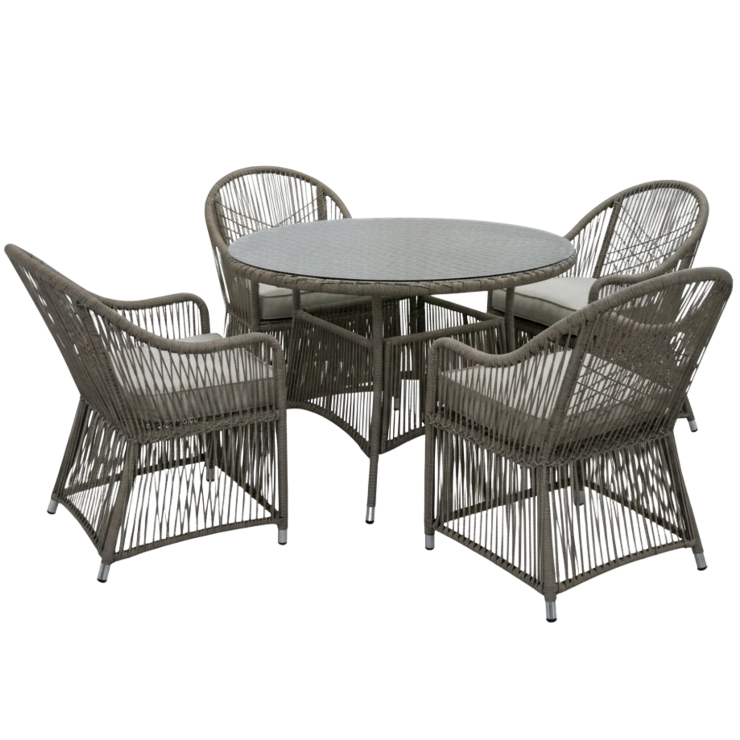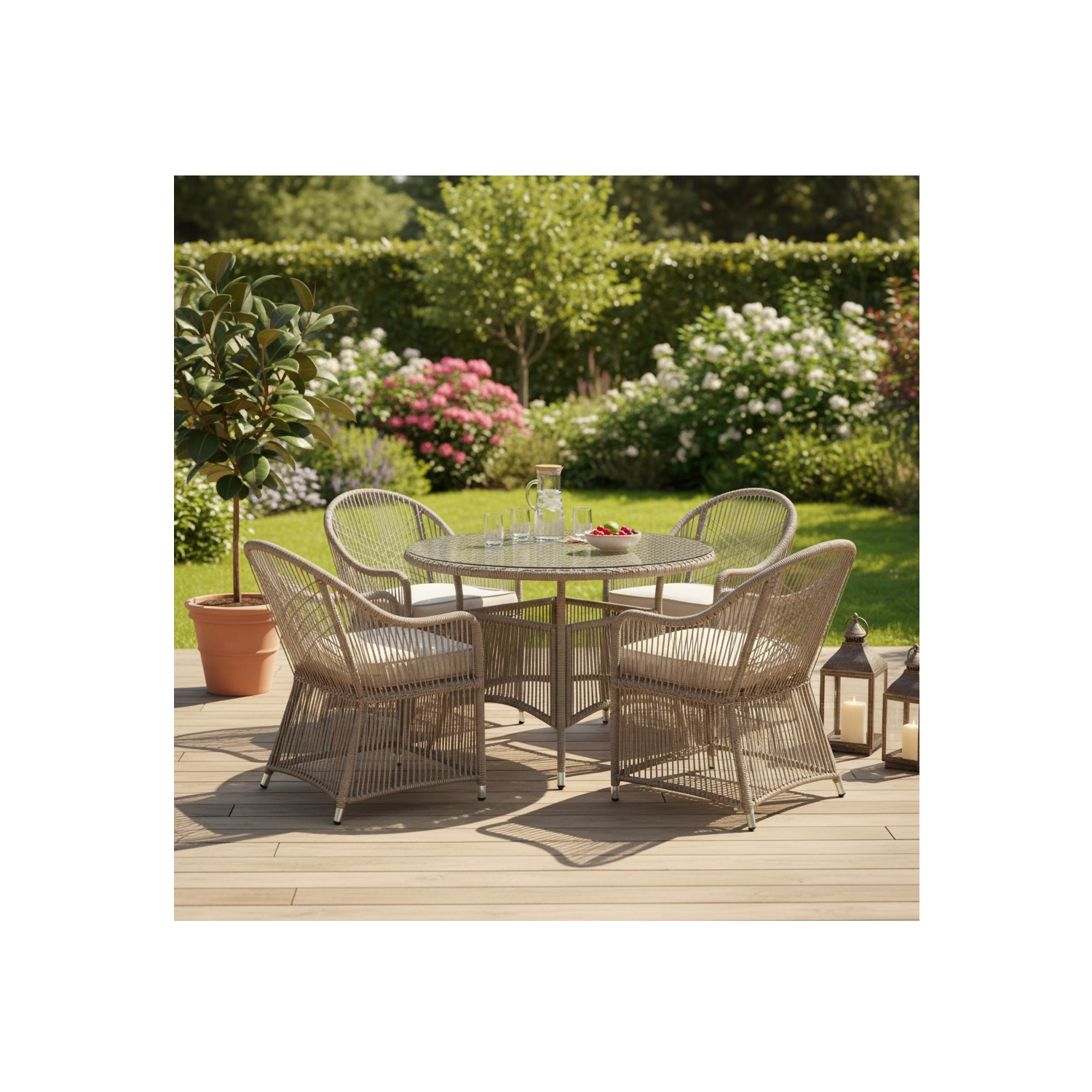 Ensemble de salle à manger de jardin 4 fauteuils et table ronde, rotin gris avec coussins