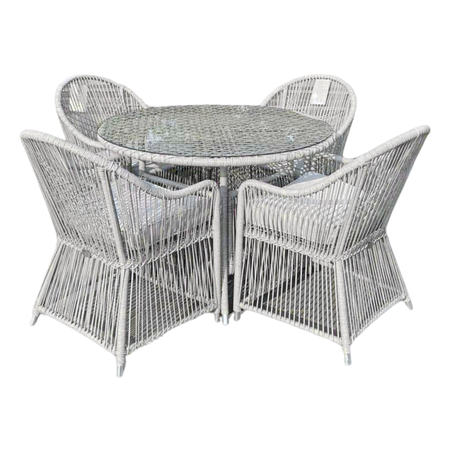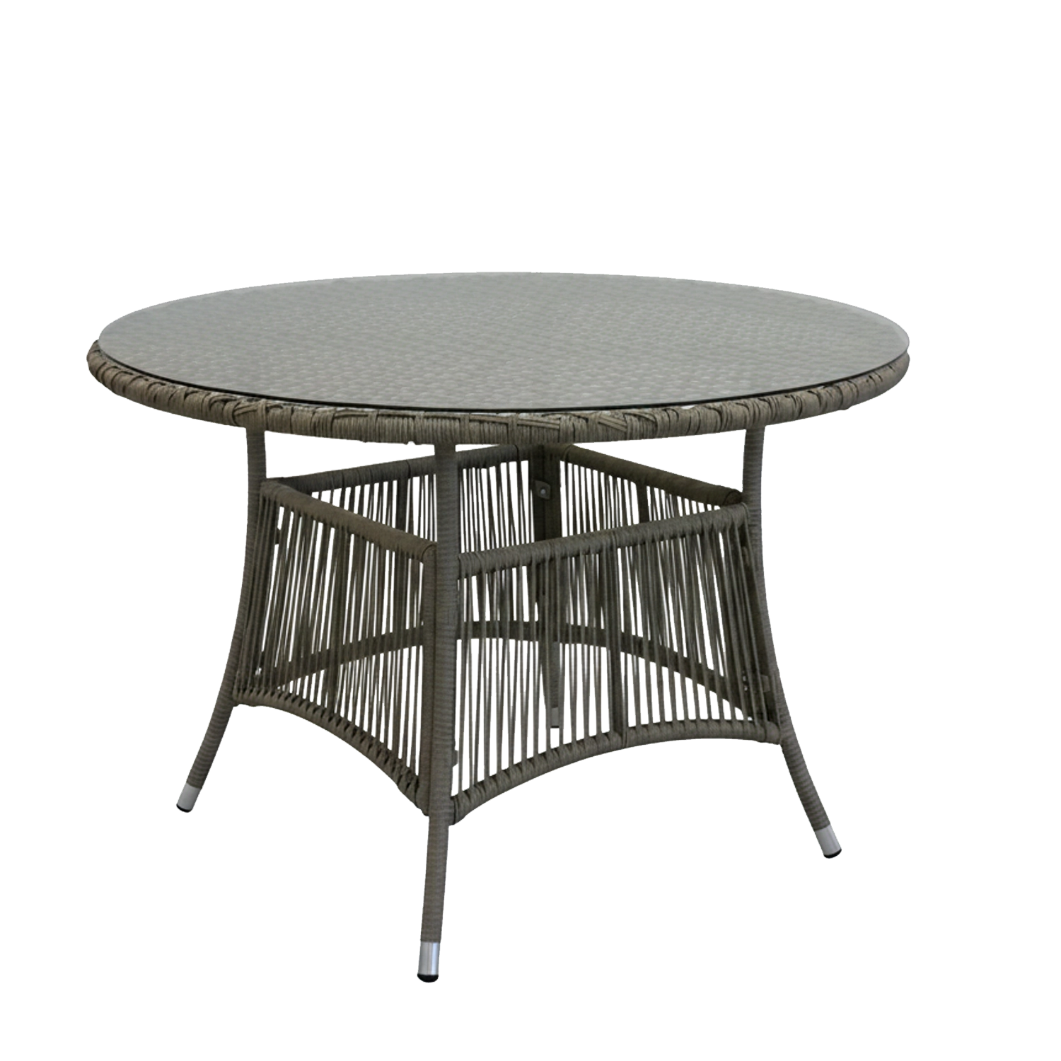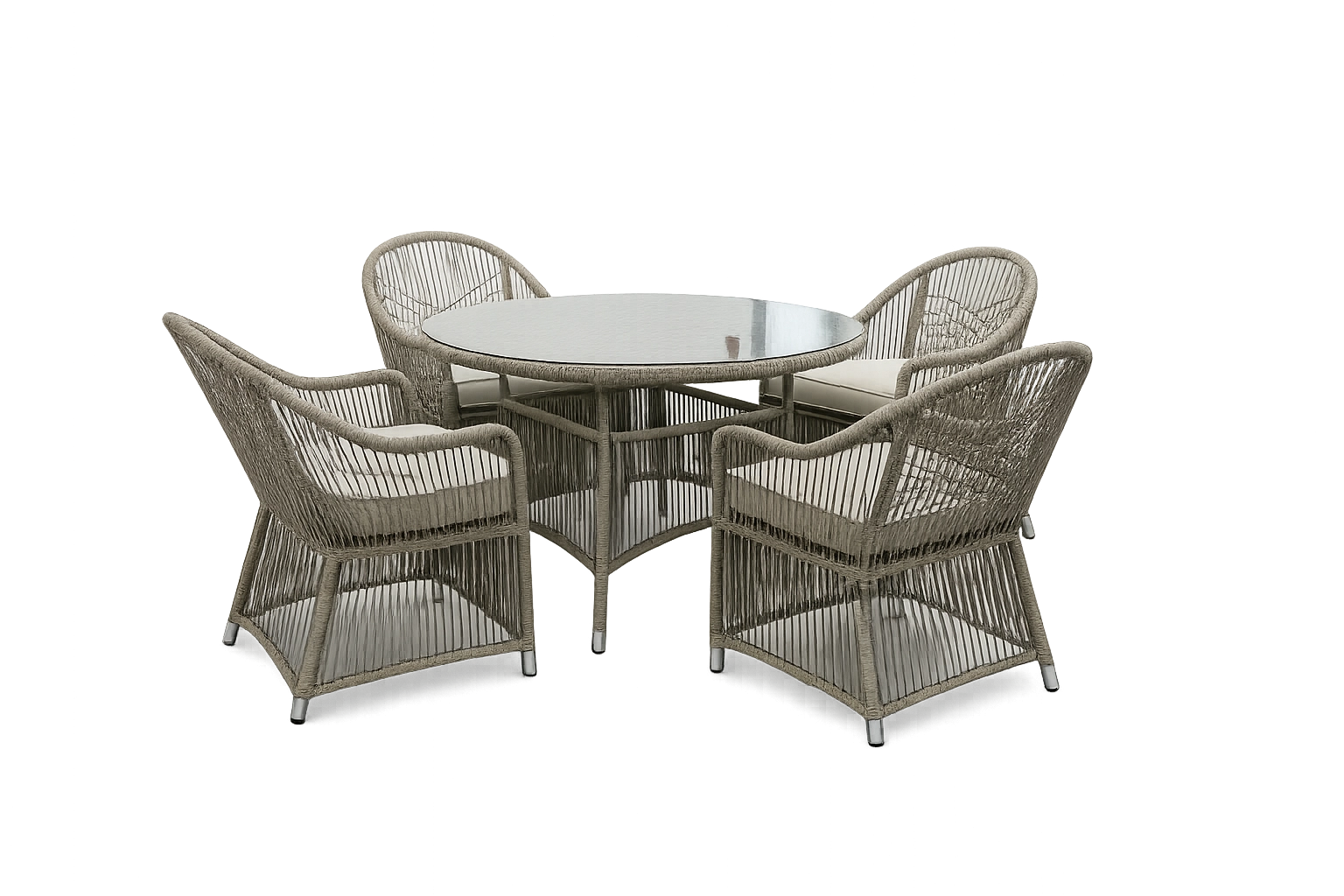 Ensemble de salle à manger de jardin 4 fauteuils et table ronde, rotin gris avec coussins