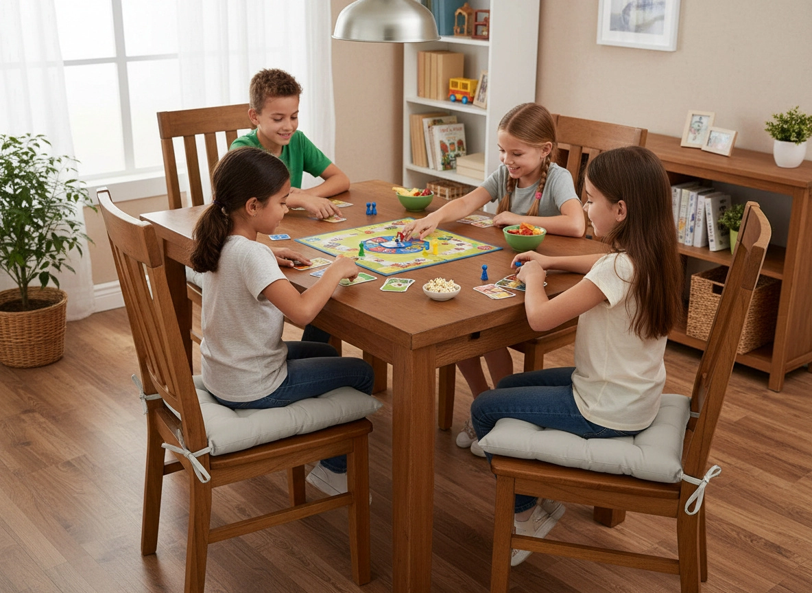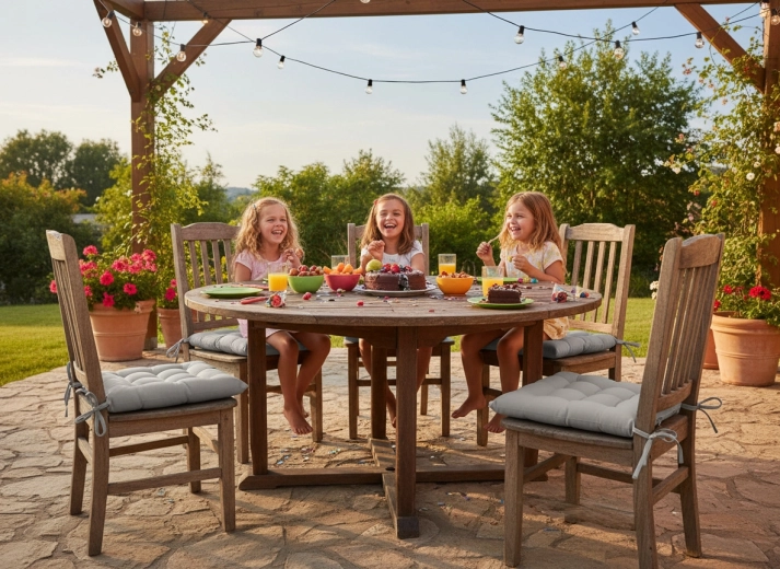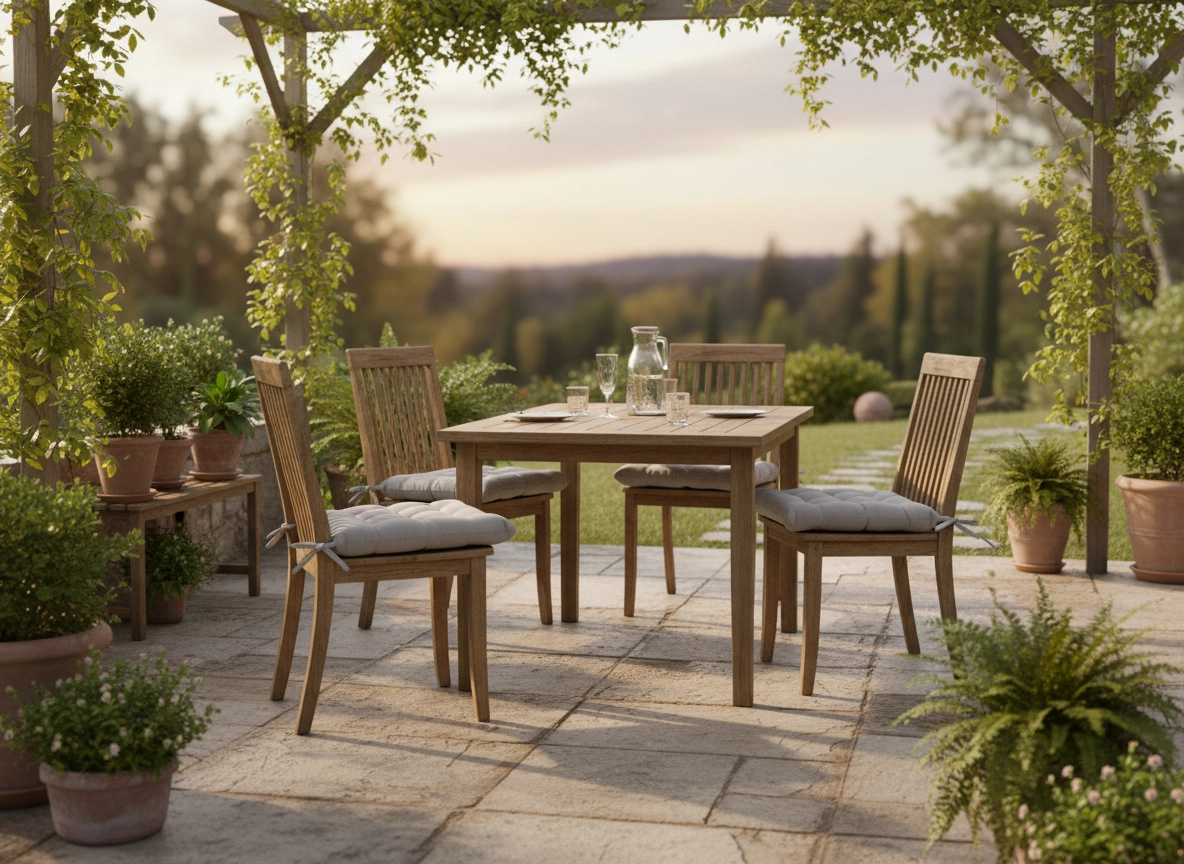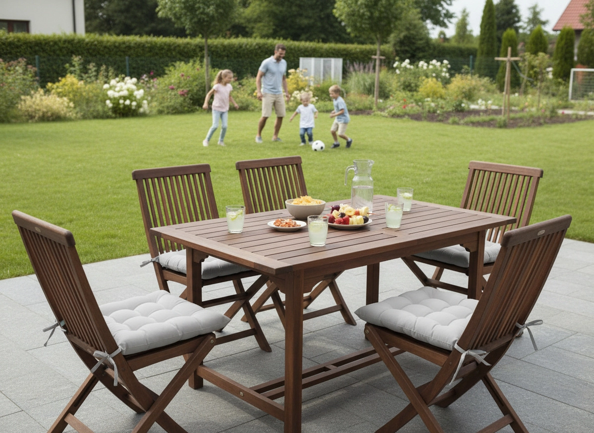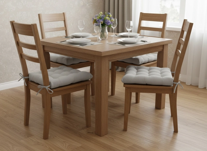 La housse 100 % polyester se nettoie facilement et résiste aux salissures courantes. Deux liens de fixation maintiennent fermement le coussin en place : il ne glisse pas et reste exactement là où il doit être — idéal pour la salle à manger, la cuisine, le bureau ou un coin détente extérieur couvert.