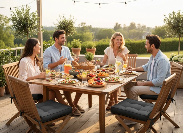 Un rembourrage de six centimètres en fibre polyester soulage le dos et les hanches et rend plus agréables les longues périodes assises lors des repas ou autour d’un café.