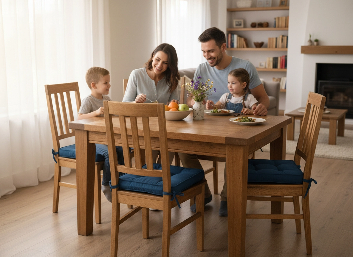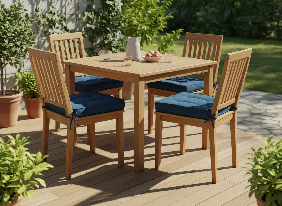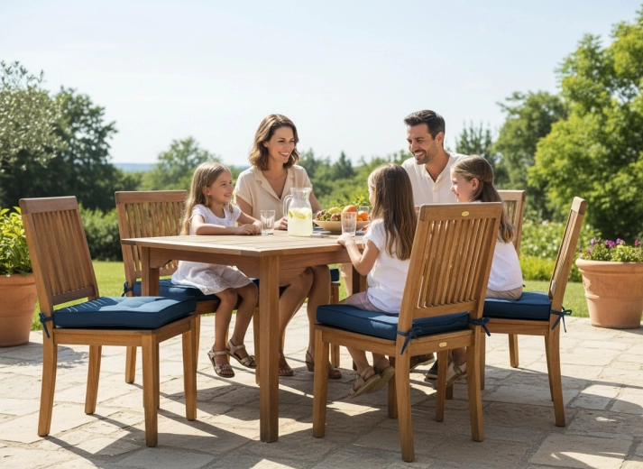 La housse en polyester résistant et le bleu intemporel conviennent à la salle à manger, à la cuisine et aux assises de jardin.