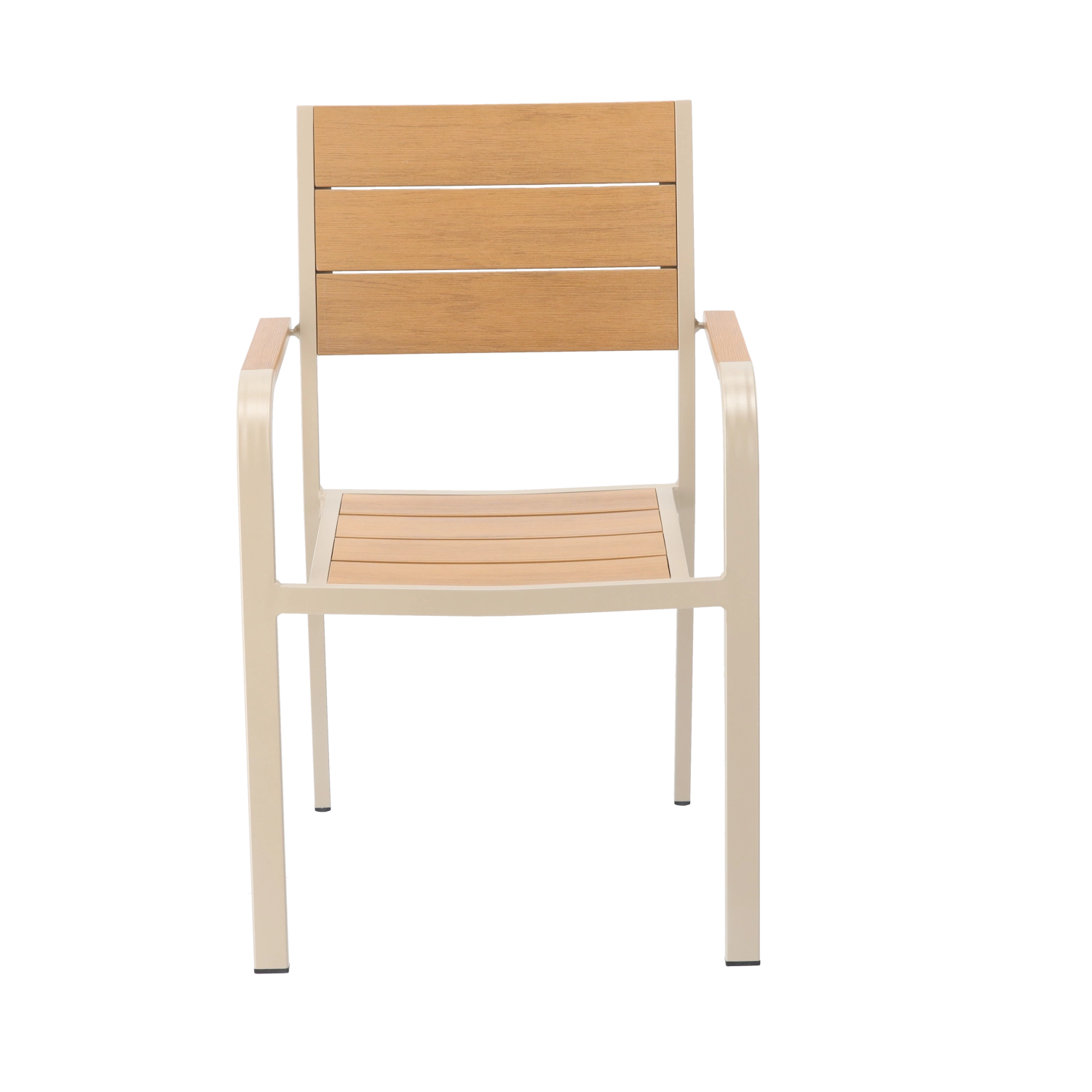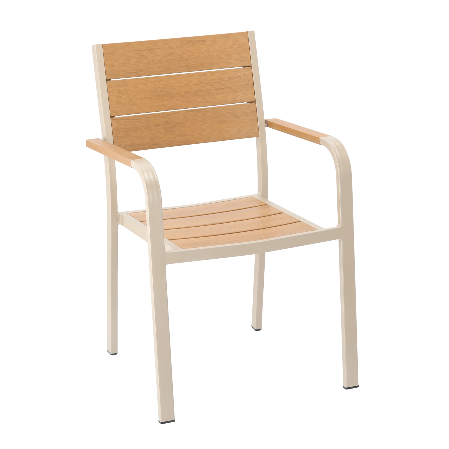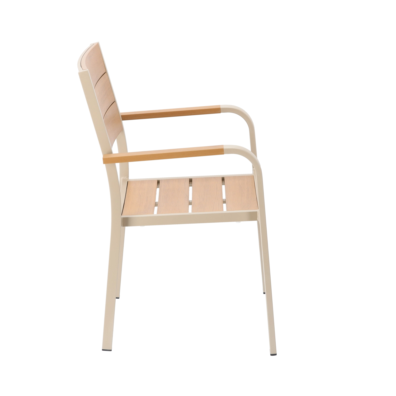 Élégante chaise de jardin beige associant un châssis en aluminium léger à des lames effet bois pour un aspect naturel sans entretien contraignant. Grâce au revêtement en poudre, elle résiste à l’humidité, au soleil et à un usage quotidien, et s’intègre parfaitement aux extérieurs modernes comme classiques.