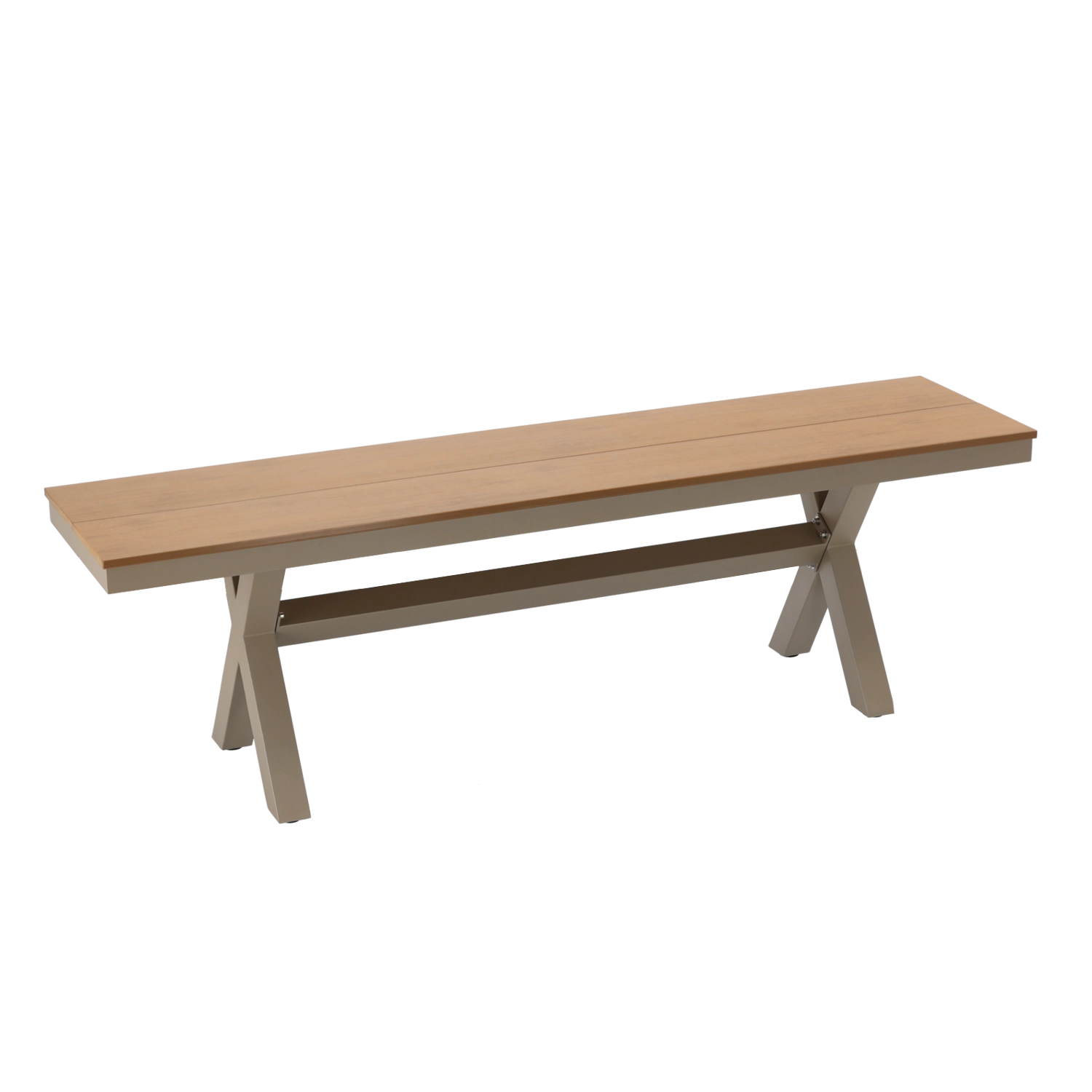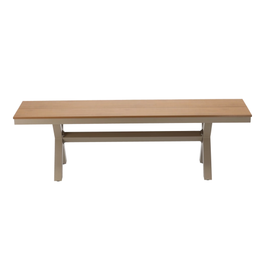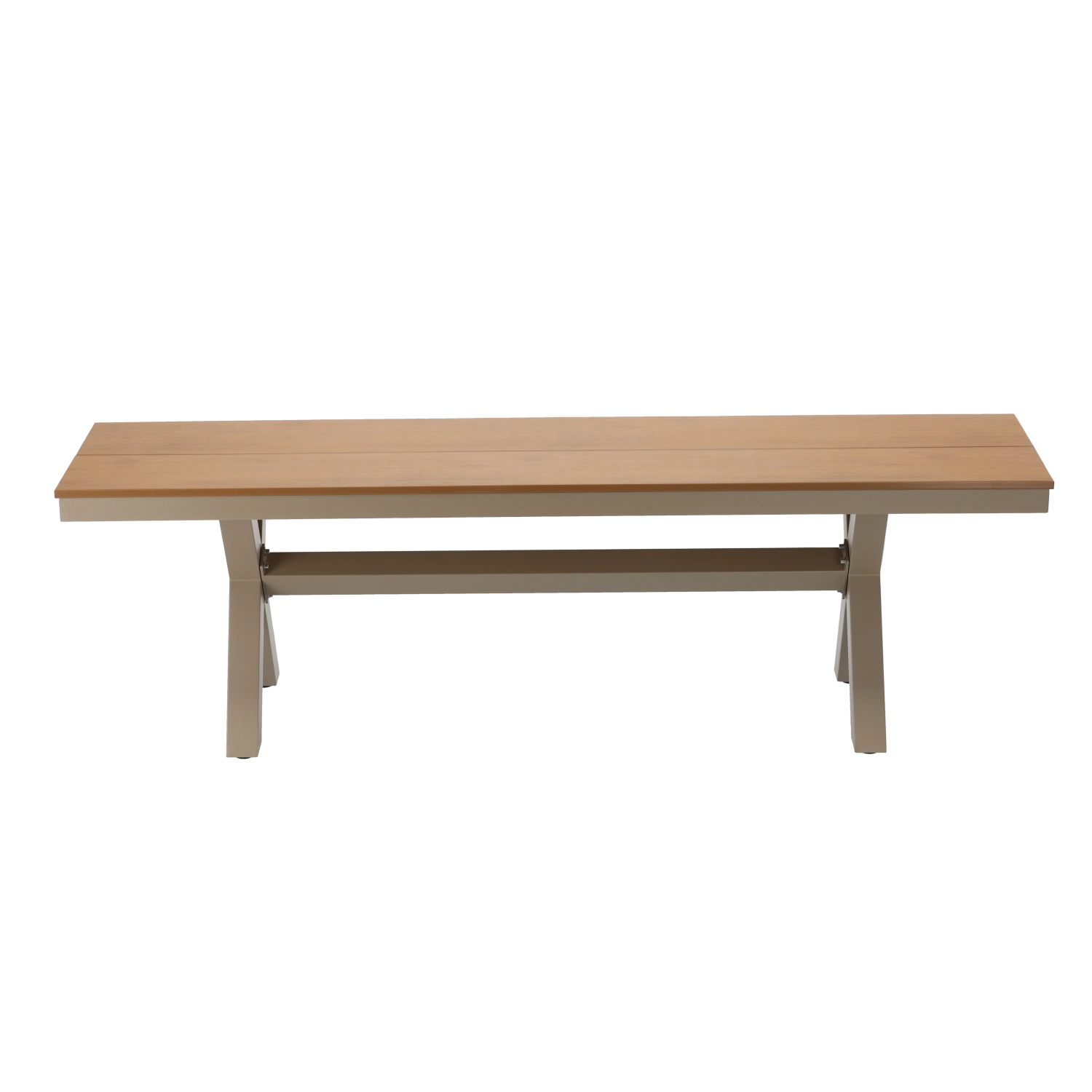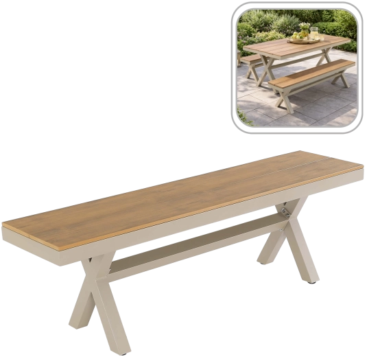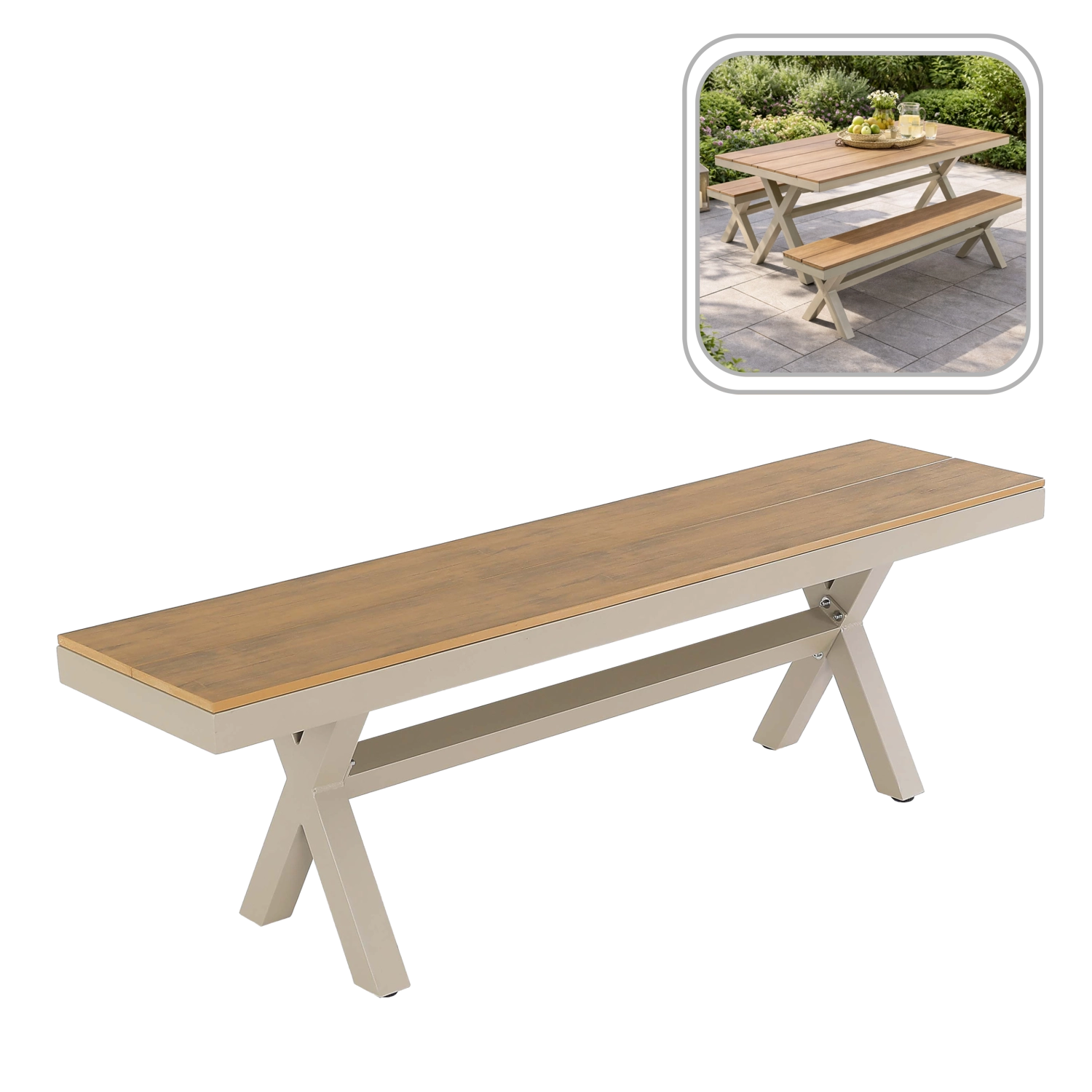 Élégant banc de jardin en aluminium de couleur beige alliant design minimaliste moderne, légèreté et stabilité et haute résistance aux intempéries. Grâce à son assise à l’aspect bois, il ne nécessite aucun entretien exigeant et s’intègre parfaitement sur la terrasse, au jardin ou près de l’entrée de la maison.