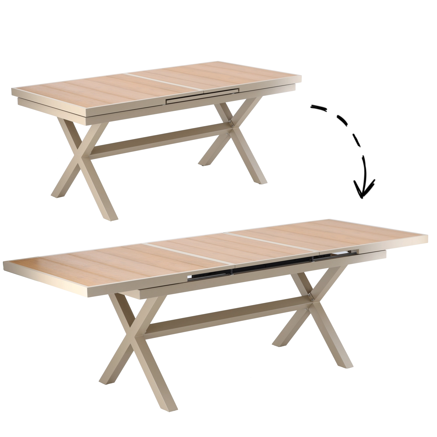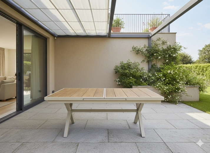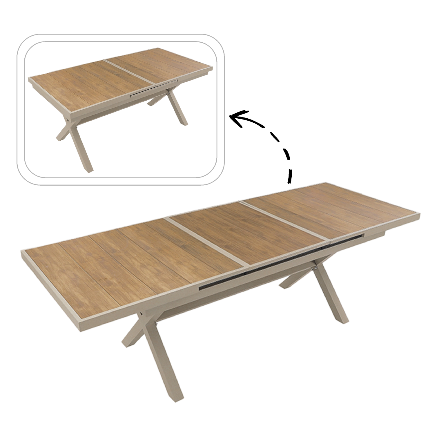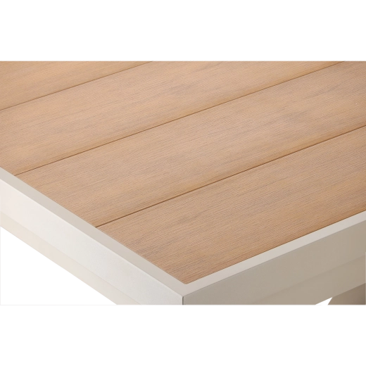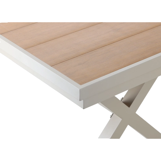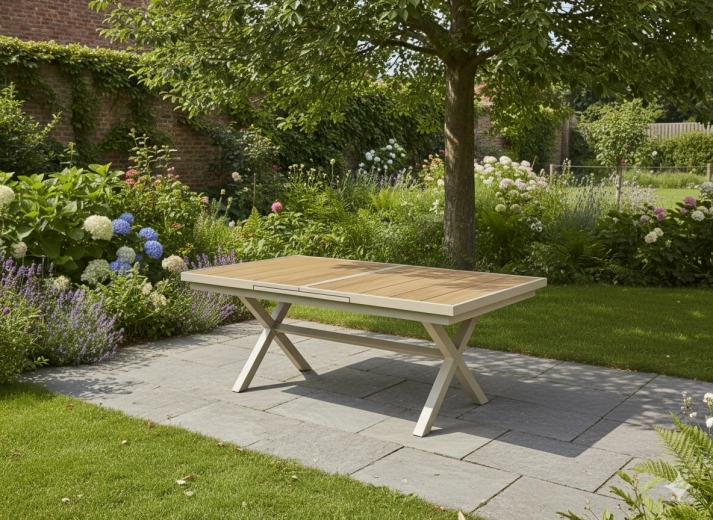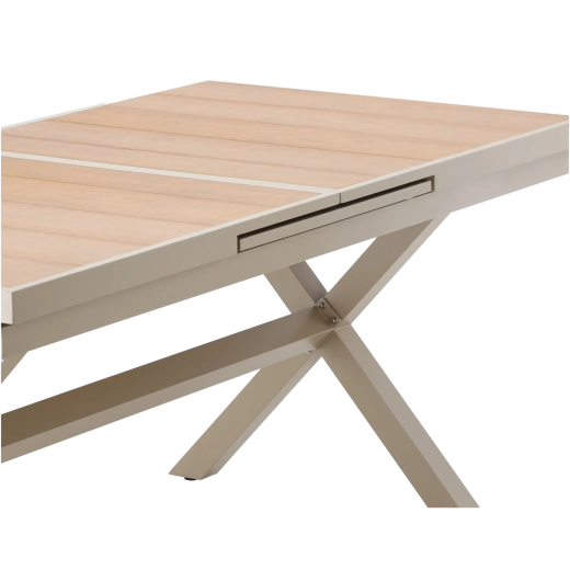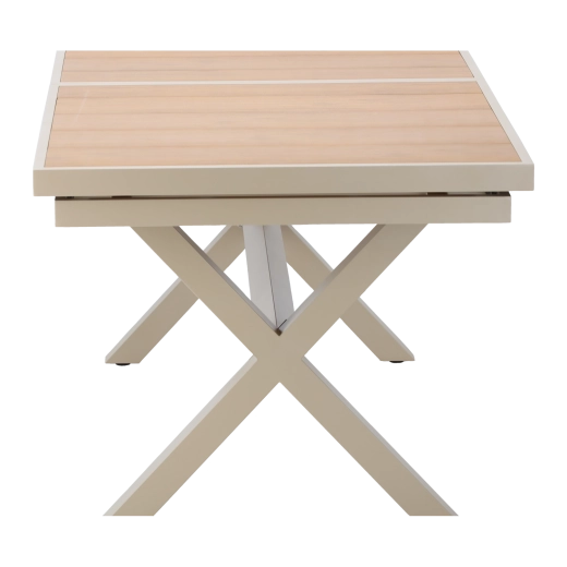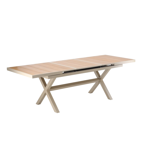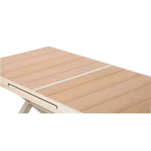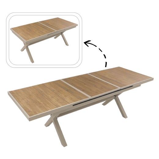 Élégante table de jardin extensible de couleur beige, alliant design moderne, structure en aluminium résistante et fonction pratique d’extension jusqu’à 240 cm. Le plateau à décor bois offre un aspect naturel et ne nécessite qu’un entretien minimal, idéal pour la terrasse, le jardin ou les espaces commerciaux.