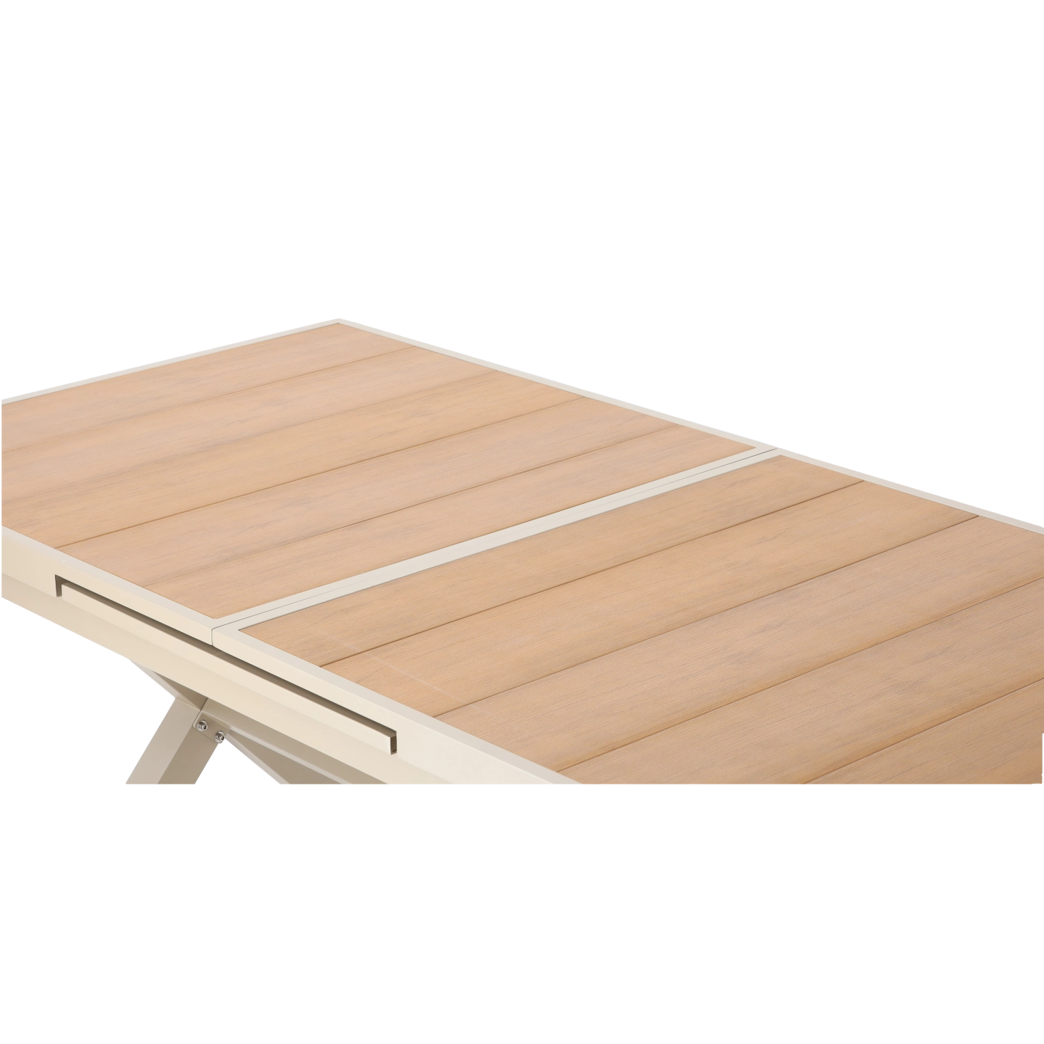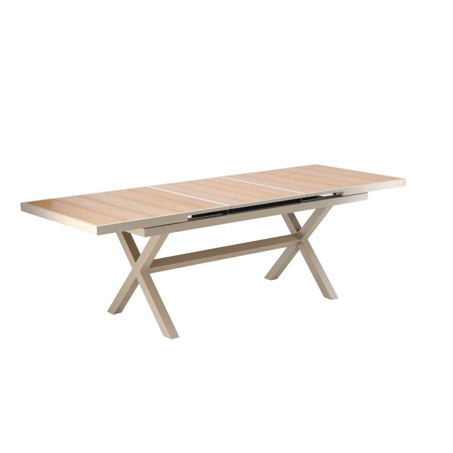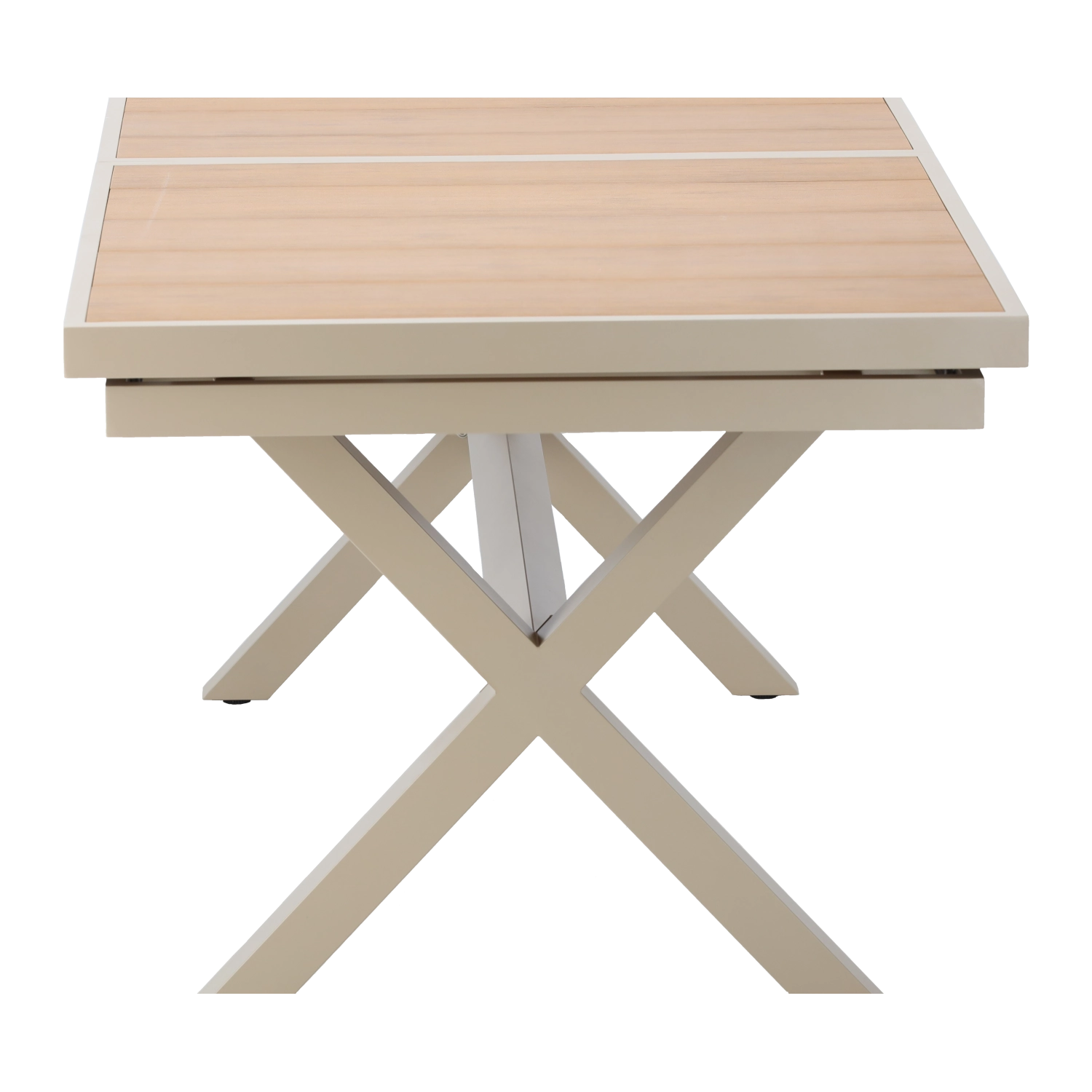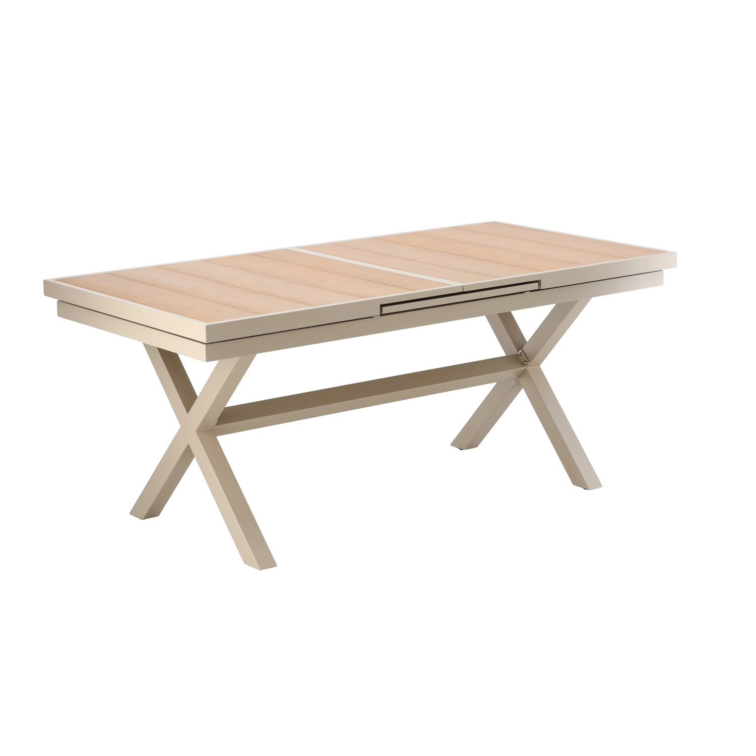 Élégante table de jardin extensible de couleur beige, alliant design moderne, structure en aluminium résistante et fonction pratique d’extension jusqu’à 240 cm. Le plateau à décor bois offre un aspect naturel et ne nécessite qu’un entretien minimal, idéal pour la terrasse, le jardin ou les espaces commerciaux.