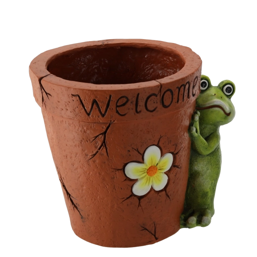 - grenouille avec fleur et inscription « Welcome », aspect terre cuite texturé