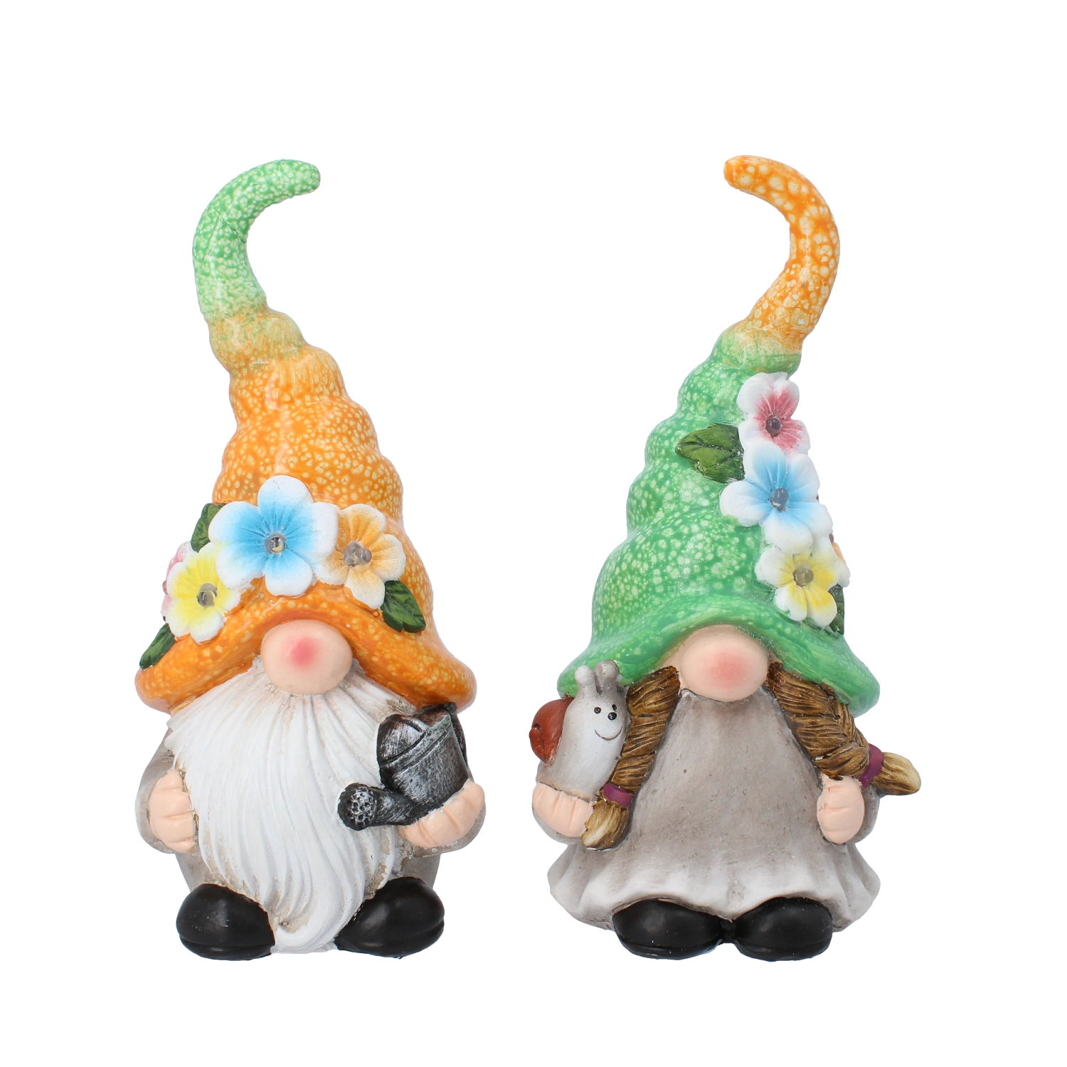 Les figurines sont fabriquées dans un matériau résistant aux intempéries, prêt à affronter sans crainte les variations saisonnières. Le format compact permet une installation aisée presque partout – des jardinières aux décors de table de jardin, ou encore sur une étagère sous pergola.
