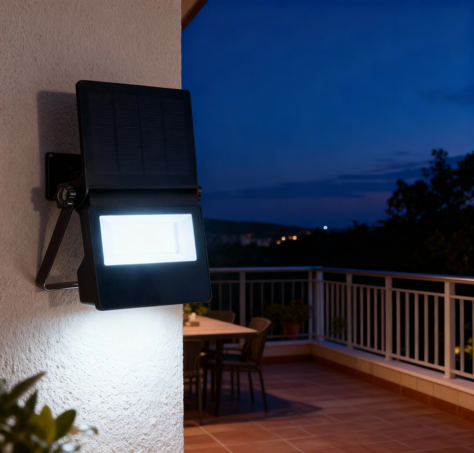 Le panneau solaire 5 V / 1,8 W recharge la batterie 1500 mAh en 7–8 heures. L’indice IP44 garantit un fonctionnement fiable en extérieur.
