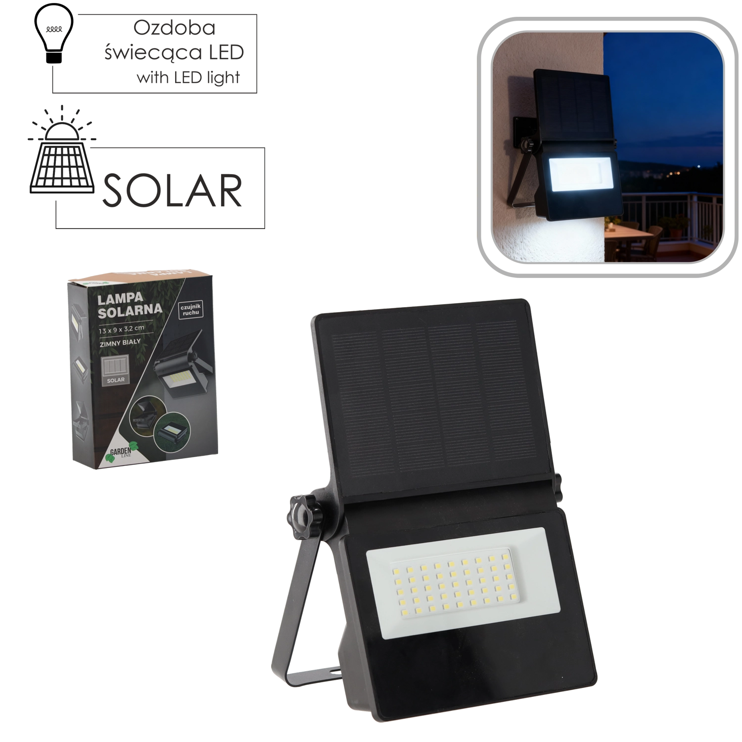 Éclairage extérieur pratique et économique sans câblage. La lampe LED solaire aux dimensions compactes 13 × 9 × 3,2 cm se recharge automatiquement pendant la journée et surveille activement l’espace à la tombée de la nuit. Le capteur PIR intégré n’allume la lumière qu’en cas de détection de mouvement, ce qui économise l’énergie et prolonge l’autonomie de la batterie.