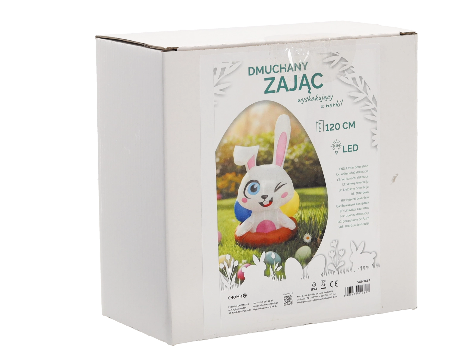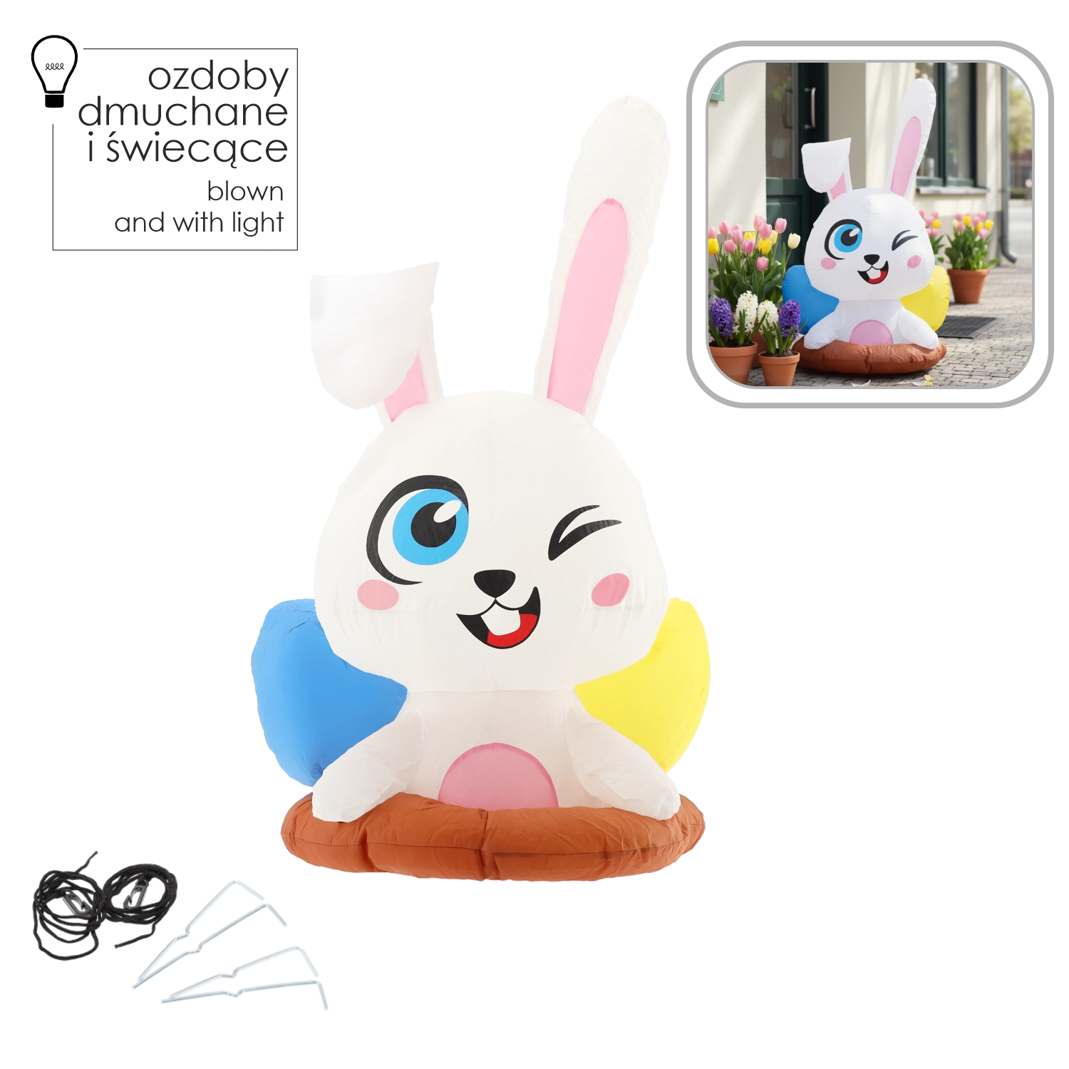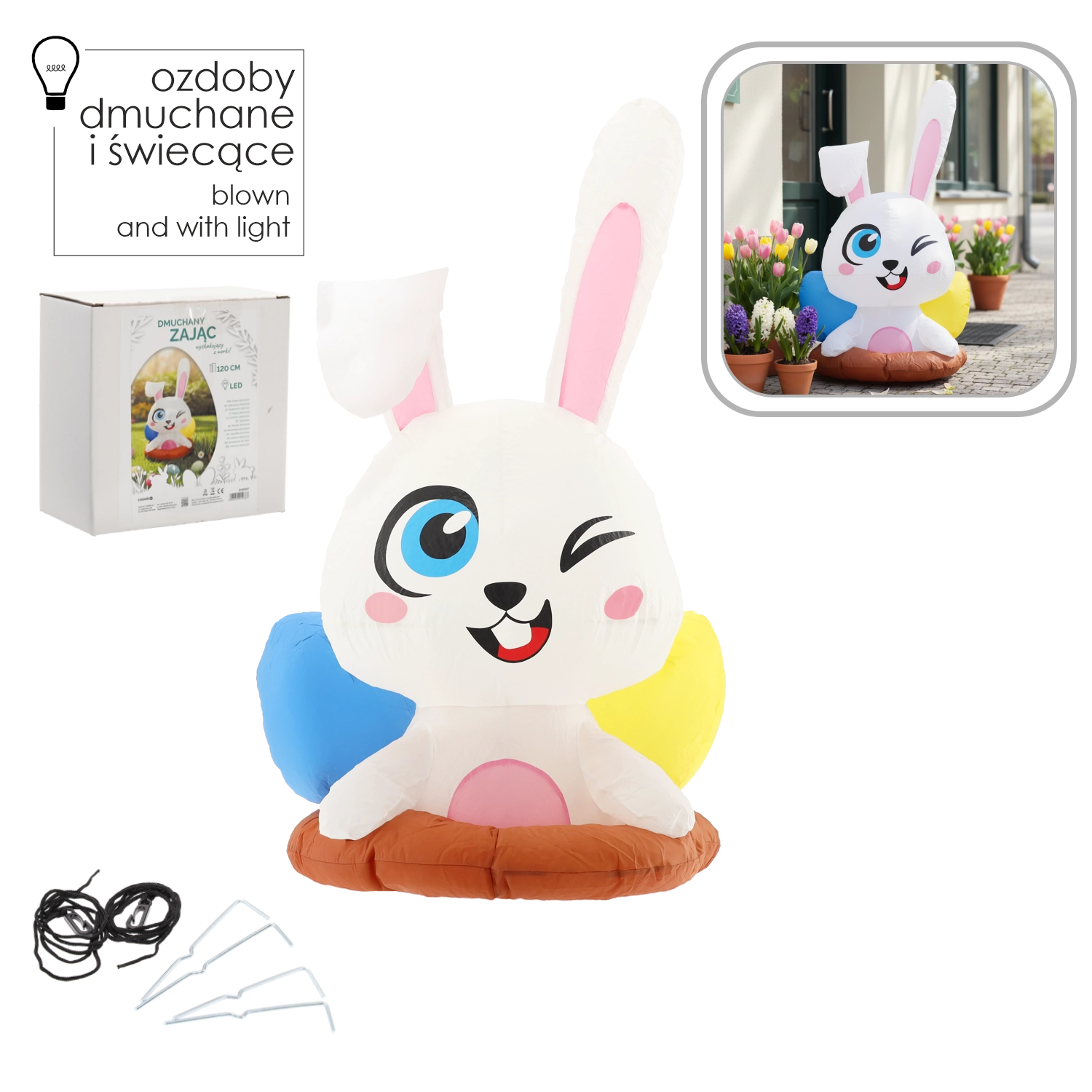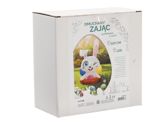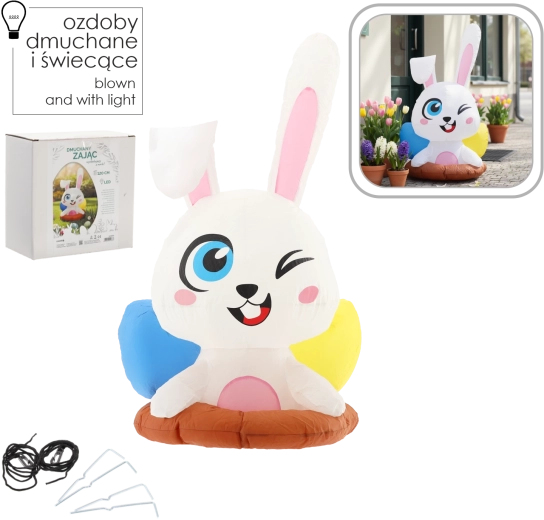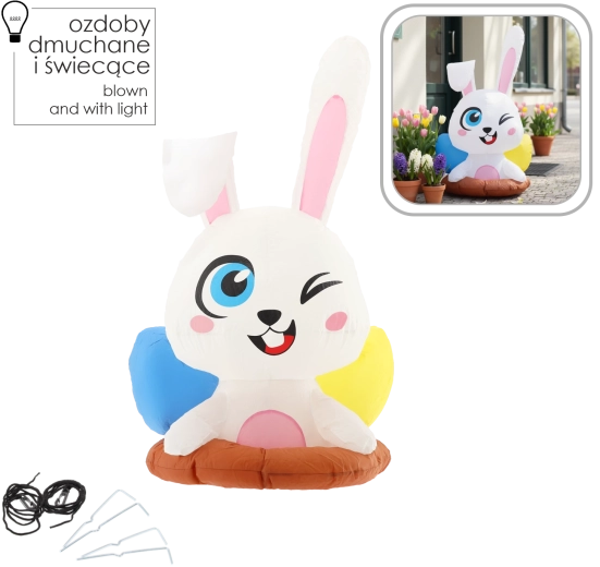 Ce joyeux lapin gonflable sortant de son terrier est une décoration de Pâques idéale pour la maison et le jardin. Grâce à la LED blanche intégrée, il brille joliment à la nuit tombée et attire l’attention des enfants comme des adultes. Sa structure légère et les accessoires fournis permettent une installation rapide et une fixation stable.