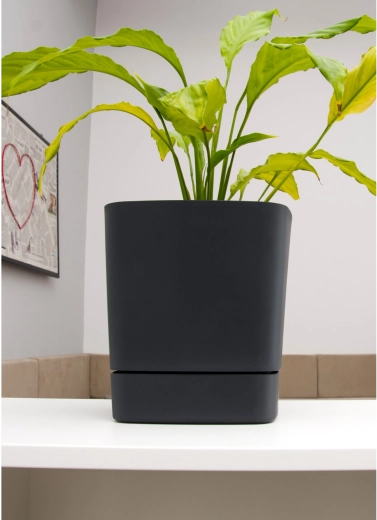 Le cache-pot avec soucoupe CLIMA est un excellent choix pour les intérieurs et extérieurs modernes. Sa forme géométrique aux arêtes légèrement arrondies et sa texture mate apportent une touche élégante, adaptée aussi bien aux espaces minimalistes que classiques. La teinte noire souligne la beauté naturelle des plantes et crée un accent stylé sur un rebord de fenêtre, une terrasse ou un balcon.