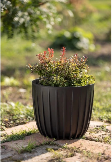Le cache-pot design Mira en version basse allie look moderne et praticité. Le noir mat avec de fines rainures offre un rendu épuré et intemporel, s’intégrant parfaitement à différents styles d’intérieurs et d’espaces extérieurs. Grâce à l’utilisation de plastique recyclé, il propose une solution écologique et durable pour la culture des plantes.