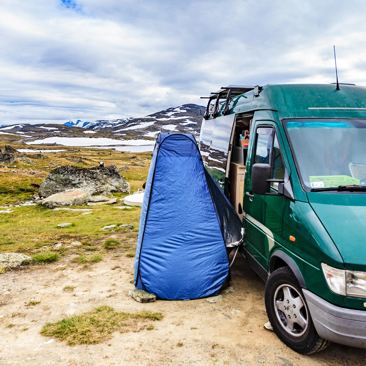 L’ouverture de toit et l’aménagement intérieur permettent l’installation d’une douche de randonnée. Le tissu opaque et l’absence de tapis de sol assurent le confort et l’évacuation de l’eau.