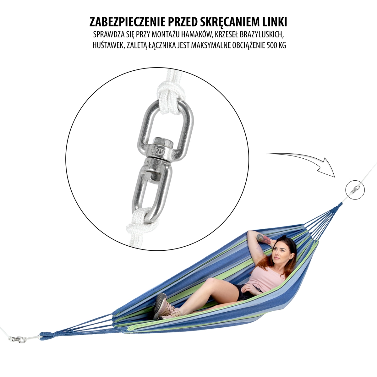 L’anneau pivotant robuste NILS Camp est conçu pour la suspension sécurisée des balançoires, hamacs et fauteuils brésiliens sans torsion ni emmêlement des cordes. Grâce à la rotation fluide à 360° et à une capacité de charge jusqu’à 500 kg par anneau, il garantit un fonctionnement souple et une longue durée de vie. Fabriqué en acier résistant avec protection de surface pour une utilisation fiable en intérieur comme en extérieur.