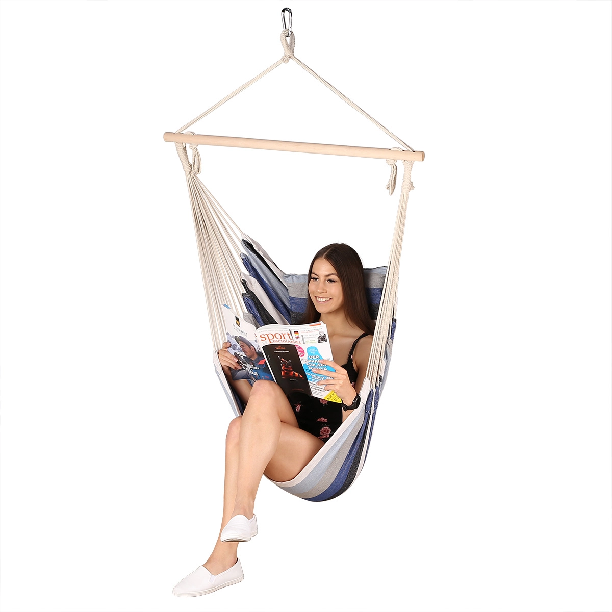 Le fauteuil brésilien combine le confort d’un hamac avec la stabilité d’un siège. La partie textile en toile mélangée résistante (60 % polyester, 40 % coton) est façonnée par des cordes solides, guidées à travers une barre d’écartement en bois et réunies en un œillet de suspension sécurisé. Il suffit de le suspendre à la bonne hauteur et de profiter de la lecture, du repos et d’un doux balancement.