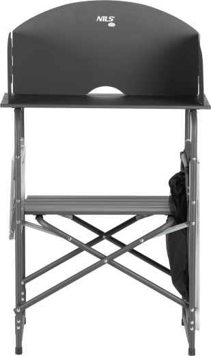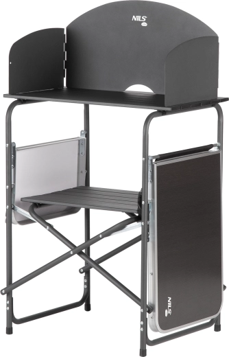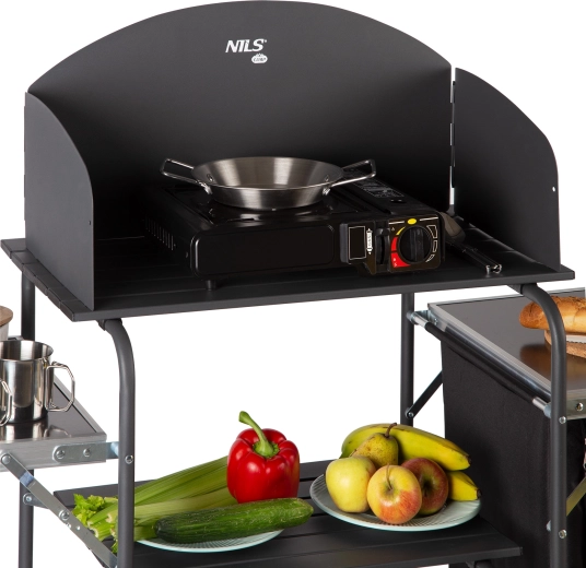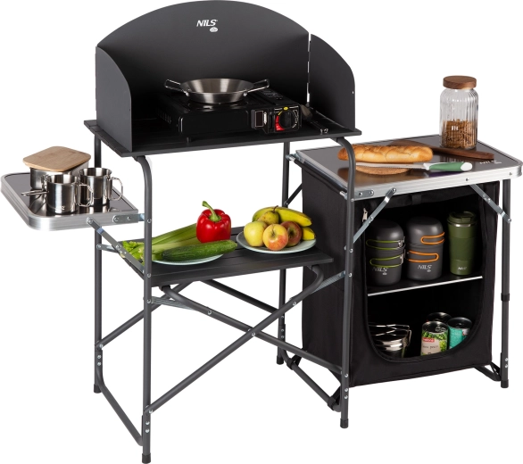 Des étagères ouvertes et une armoire spacieuse fermable maintiennent la vaisselle, les aliments et les accessoires parfaitement organisés. La structure pliante avec pieds antidérapants permet un montage et un démontage rapides ainsi qu’un transport aisé dans le sac fourni.