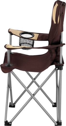 Le confort est renforcé par des accoudoirs réglables et un panier porte-boisson pratique placé sur l’accoudoir droit. La chaise se plie facilement à des dimensions compactes et se range dans la housse fournie avec sangle d’épaule – idéale pour un transport et un stockage rapides.