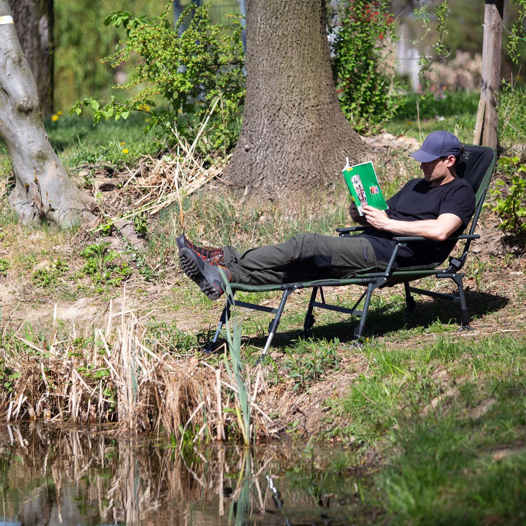 Le dossier à réglage fluide et le repose‑pieds amovible transforment le fauteuil en un confortable transat – idéal pour les longues attentes au bord de l’eau comme pour se reposer après une randonnée.