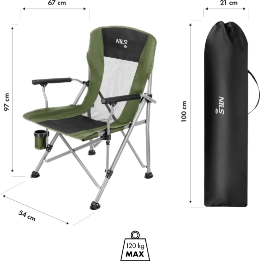 Profitez du confort partout grâce au fauteuil pliant NILS Camp en vert. Sa largeur de 54 cm et son dossier haut offrent un soutien dorsal fiable même lors de longues sessions assises, tandis que la structure stable assure une assise sûre sur différents types de surfaces. La charge maximale de 120 kg couvre les besoins de la plupart des utilisateurs.