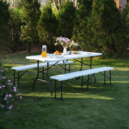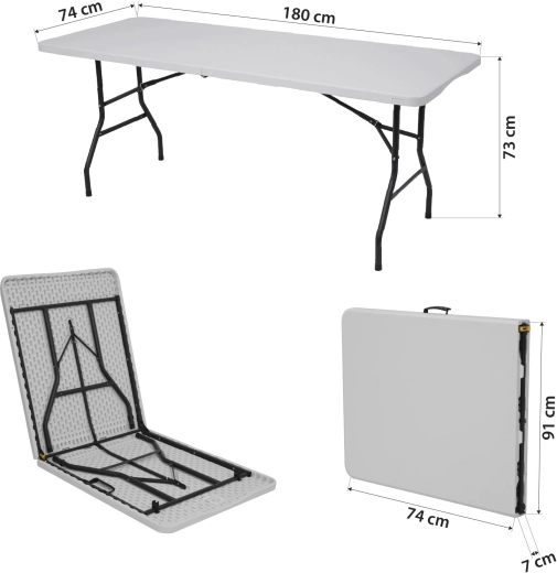 Sa grande surface de 180 × 74 cm offre suffisamment d’espace pour les invités, les rafraîchissements et l’équipement. La hauteur ergonomique de 73 cm est confortable aussi bien assis que debout. Le système de pliage pratique transforme la table en une « valisette » compacte avec poignée de transport, afin que vous puissiez la ranger facilement dans la voiture, une armoire ou sous le lit.