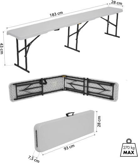Le banc se distingue par un pliage rapide et intuitif en un format compact, avec une poignée pratique pour le transport. Son faible poids de 6,5 kg et sa longueur pliée de seulement 93 cm permettent un transport facile en voiture, au chalet ou en camping.