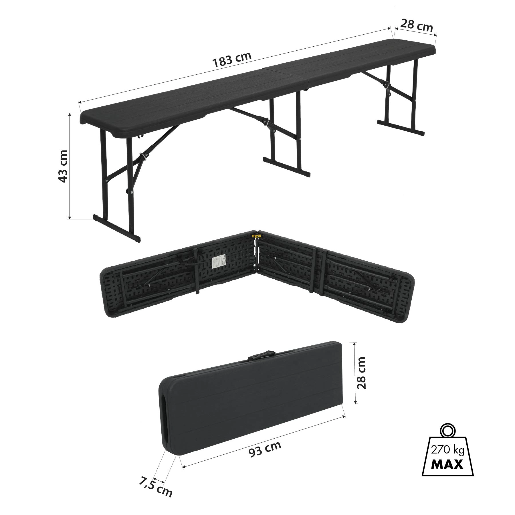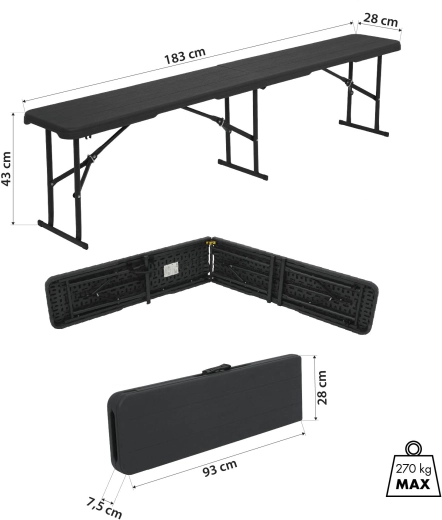 Banc pliant pratique et résistant pour le jardin, le camping et les événements. Il offre une longue surface d’assise de 183 cm, une capacité de charge jusqu’à 270 kg, un pliage facile et un poids réduit de 6,5 kg. La structure en HDPE et acier avec revêtement par poudre garantit stabilité, entretien aisé et longue durée de vie.