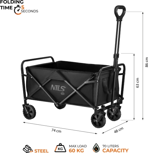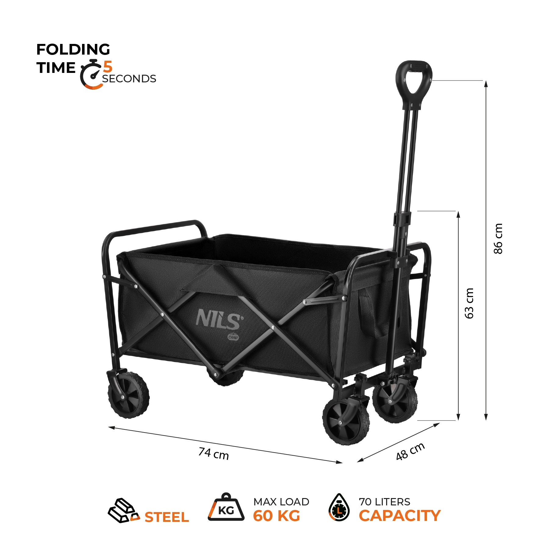 Léger et pourtant robuste, le chariot pliable NILS Camp facilite le transport de l’équipement pour les excursions, le camping et même les courses. Il offre un volume de 70 l, une capacité de charge de 60 kg, un matériau résistant Oxford 600D avec PVC et une poignée réglable pour une conduite confortable. Grâce à son pliage rapide, il se glisse facilement dans le coffre de la voiture et économise de la place à la maison.