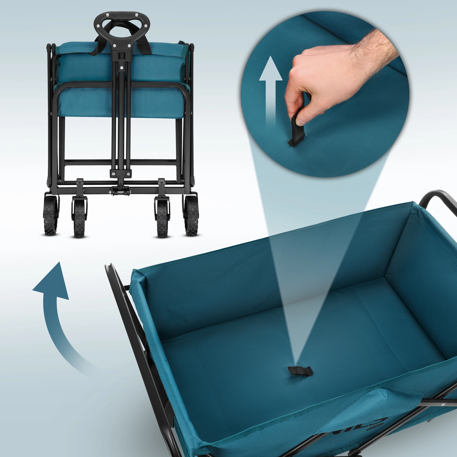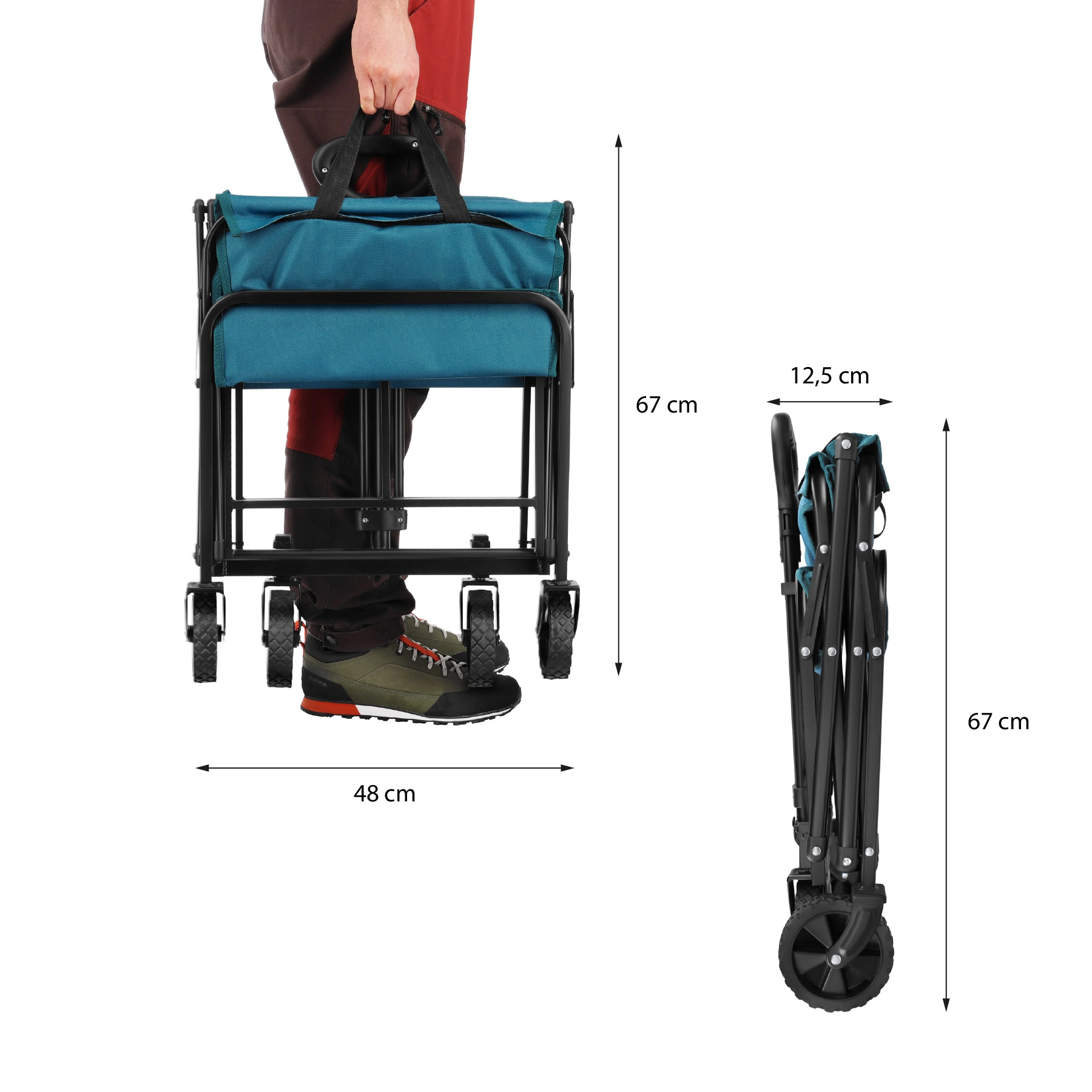 Sa grande capacité de 70 l et sa charge utile de 60 kg permettent d’emporter serviettes, couvertures, équipements de sport, courses et accessoires pour enfants en une seule fois. La poignée réglable s’adapte à votre taille et à votre façon de tirer, pour une manipulation naturelle et confortable même sur de plus longues distances.