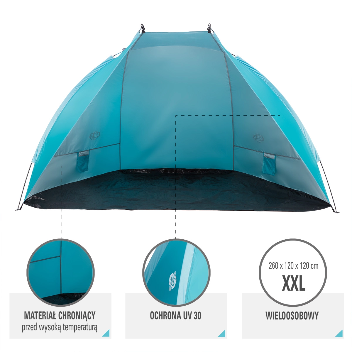 Grâce au tapis de sol imperméable, ni le sable humide ni une petite averse ne vous prendront au dépourvu. À l’intérieur, vous trouverez deux poches pratiques pour les petits objets comme les clés ou le portefeuille. Une fois pliée, la tente tient dans un sac compact avec poignée, ce qui la rend idéale pour voyager, à la mer comme au lac.