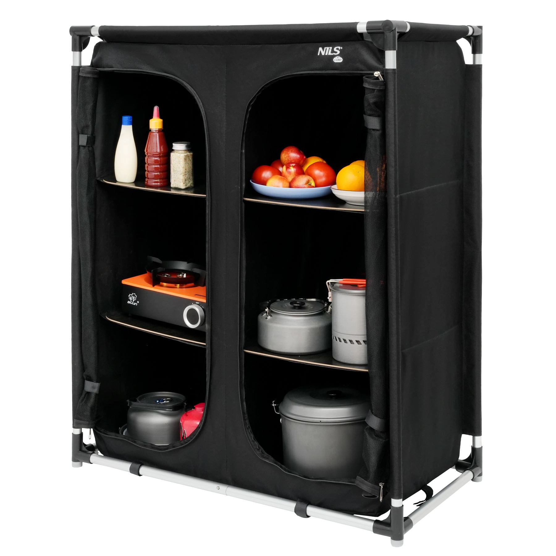 Six étagères spacieuses (2 sections × 3) maintiennent vêtements, vaisselle et provisions bien organisés et stables grâce à des inserts rigides.