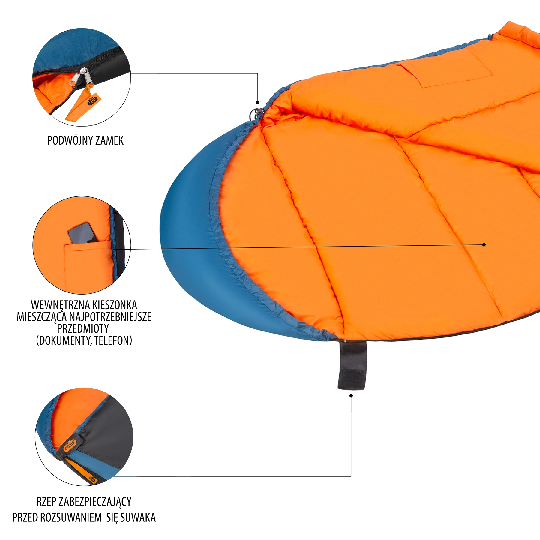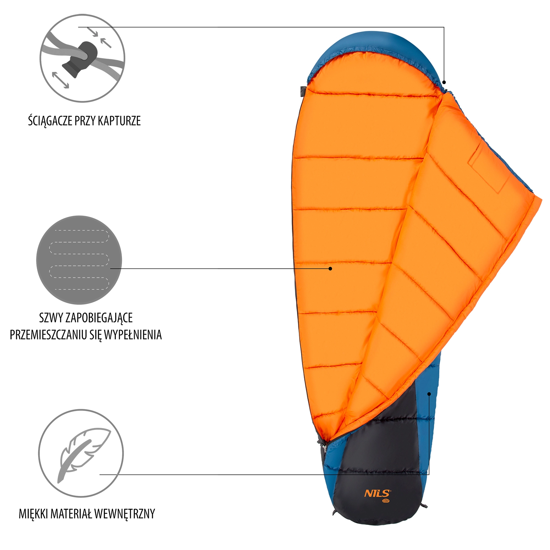 Le garnissage en fibre creuse 300 g/m² offre une isolation équilibrée, le piquage empêche le déplacement du rembourrage et assure une chauffe uniforme. La fermeture éclair à double sens est couverte par un rabat isolant et sécurisée par un large soufflet à velcro, évitant toute ouverture pendant le sommeil. La capuche avec cordon de serrage et bloqueur aide à conserver la chaleur au niveau de la tête. Une fois rangé dans le sac de compression, vous réduisez le volume d’environ un tiers.