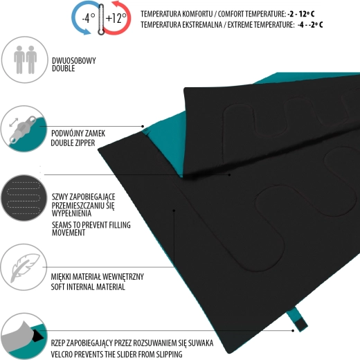 L’isolation en fibres de polyester de 250 g/m² retient uniformément la chaleur grâce à un matelassage de qualité qui empêche le déplacement du garnissage. Le tissu extérieur 190T polyester W/R Cire résiste mieux à l’humidité, tandis que la doublure 190T Pongee est agréable au toucher. La fermeture éclair à double sens, présente sur le côté et le bas et sécurisée par une large patte à velcro, reste fiable même en cas de mouvements fréquents pendant la nuit.