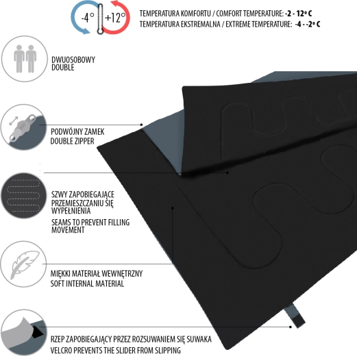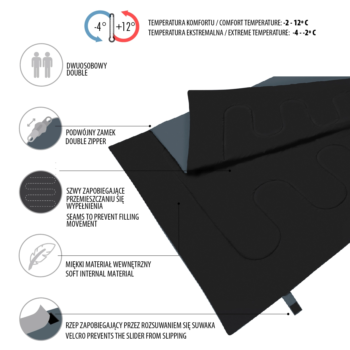 Le sac de couchage couverture pour deux personnes NILS Camp est un excellent choix pour le camping, la randonnée et les escapades du week-end. L’extérieur en polyester 190T W/R Cire et la doublure douce en 190T Pongee, associés à un garnissage en fibres de polyester 250 g/m², offrent un confort thermique stable et une résistance à l’humidité. Le matelassage sur toute la surface maintient le garnissage en place pour une isolation uniforme toute la nuit.