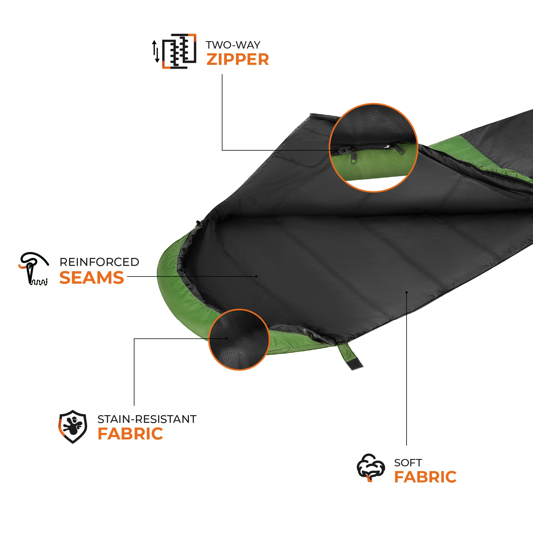Le garnissage double en polyester retient efficacement la chaleur tout en laissant respirer. Parfait pour les nuits de printemps et d’été, avec une marge jusqu’à 0 °C en conditions d’urgence.