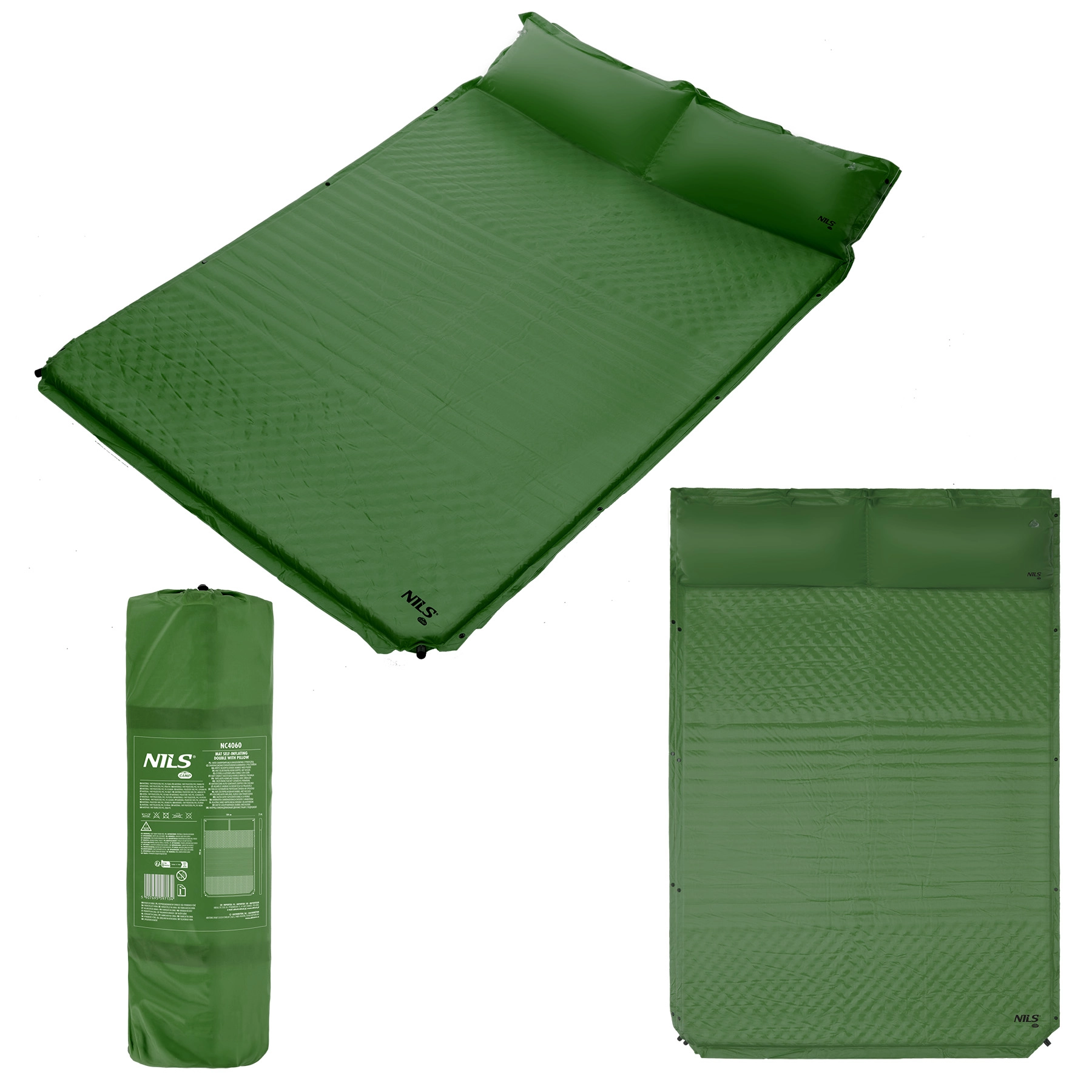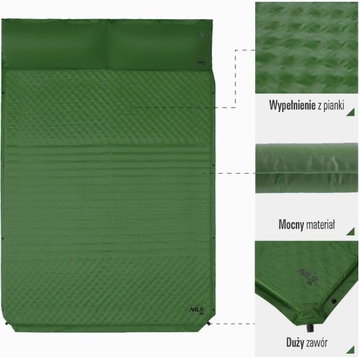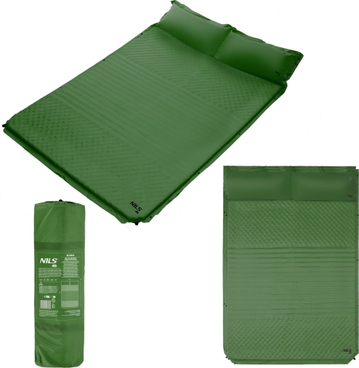 Large matelas autogonflant pour deux personnes de la marque NILS CAMP, offrant un couchage confortable en randonnée, sous tente ou sur la plage. Grâce à son système autogonflant, à sa largeur de 130 cm et à son oreiller intégré, il garantit un confort sans effort. Il se range facilement à l’aide de sangles de maintien, présente des dimensions compactes une fois plié et est fabriqué à partir de matériaux résistants. Un sac de transport et un kit de réparation sont inclus.