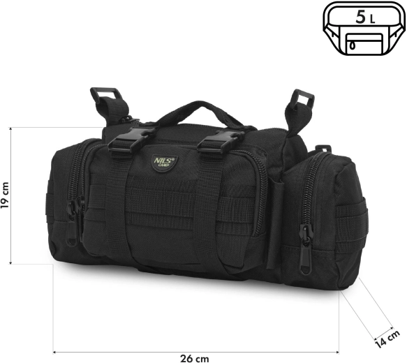 NILS Camp NC3907 est une banane XL au caractère tactique qui allie dimensions compactes et capacité de rangement surprenante. Elle propose un volume de 5 litres et accueille téléphone, portefeuille, clés, papiers, multitool, powerbank et autres petits objets. Avec ses dimensions de 26 × 19 × 14 cm, elle ne gêne pas les mouvements et s’adapte facilement à votre style de port – en banane ou en bandoulière.