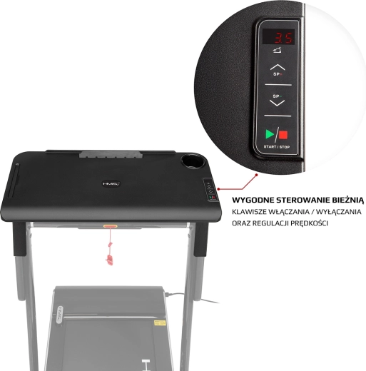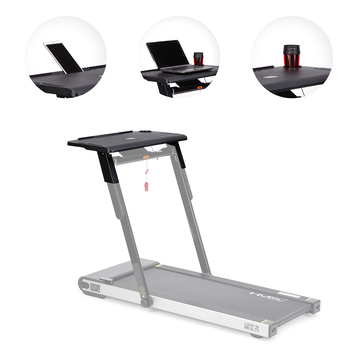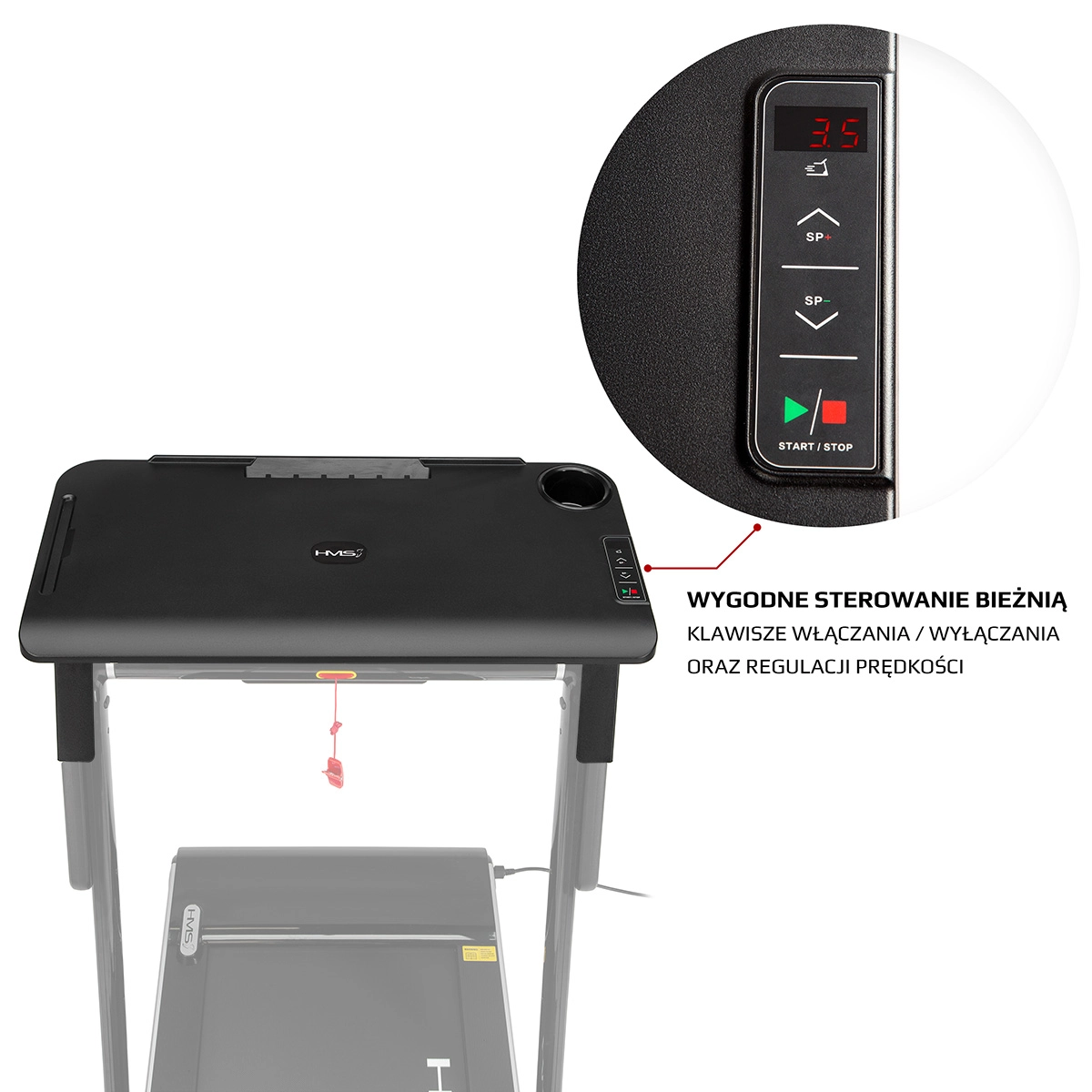 La HMS STB12 est une extension intelligente pour le tapis de course HMS LOOP12 qui vous permet de combiner vos obligations professionnelles avec une activité physique légère. Le plateau large et robuste supporte aisément un ordinateur portable et ses accessoires, tandis que le porte-bouteille/gobelet pratique et la fente pour tablette ou téléphone gardent tout à portée de main. Le panneau de commande séparé sur le plateau permet un ralentissement ou un arrêt immédiat du tapis.