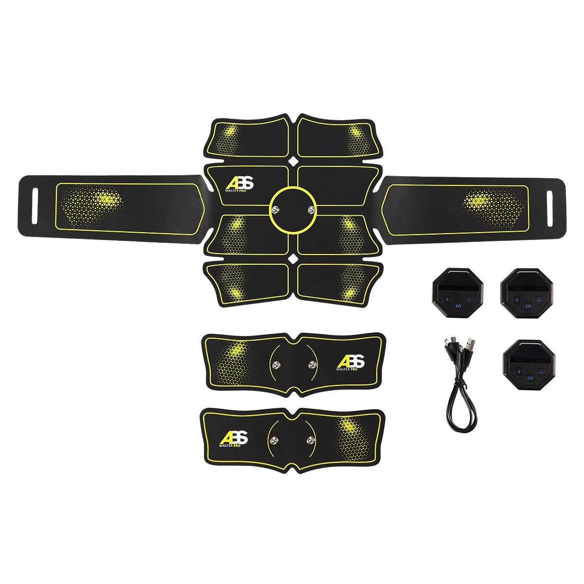 Une grande électrode abdominale et deux plus petites pour les bras ou les jambes, trois unités de commande et un câble de charge – tout ce dont vous avez besoin pour un entraînement EMS efficace à domicile.