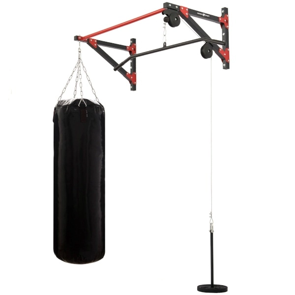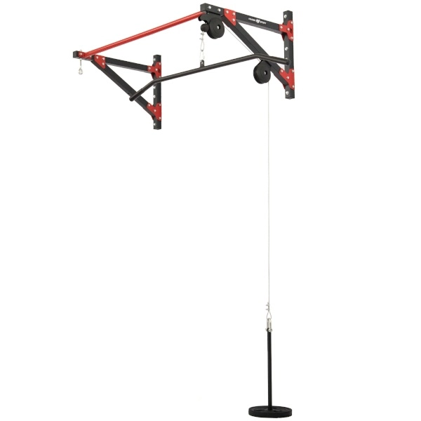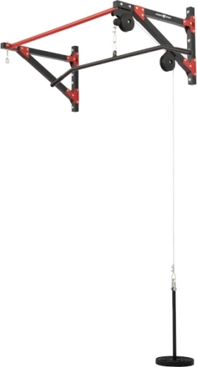 Le système de poulie est équipé d’un câble en acier avec mousquetons aux deux extrémités. La charge se place sur un axe de 22 mm de diamètre et 46 cm de longueur, compatible avec les disques standards. Un adaptateur/barre large de 120 cm avec poignées en caoutchouc, pour tirages verticaux et autres exercices de traction, est également inclus. L’œillet pour suspendre le sac est positionné à 69 cm du mur et la barre est déportée du mur de 69 cm pour offrir un espace suffisant pendant l’entraînement.